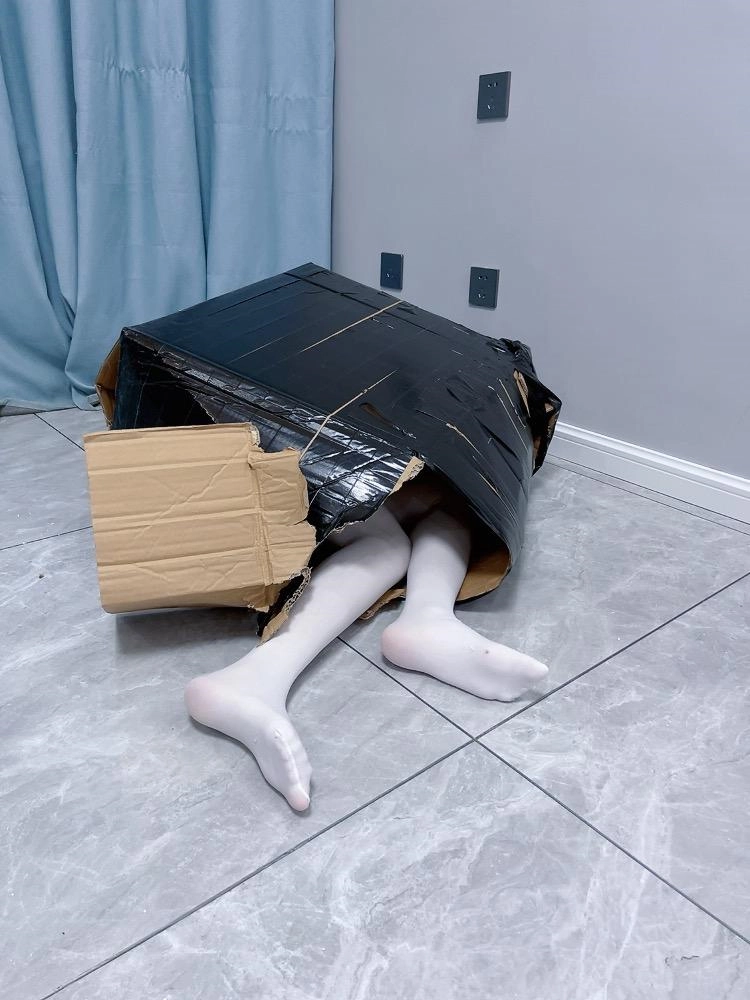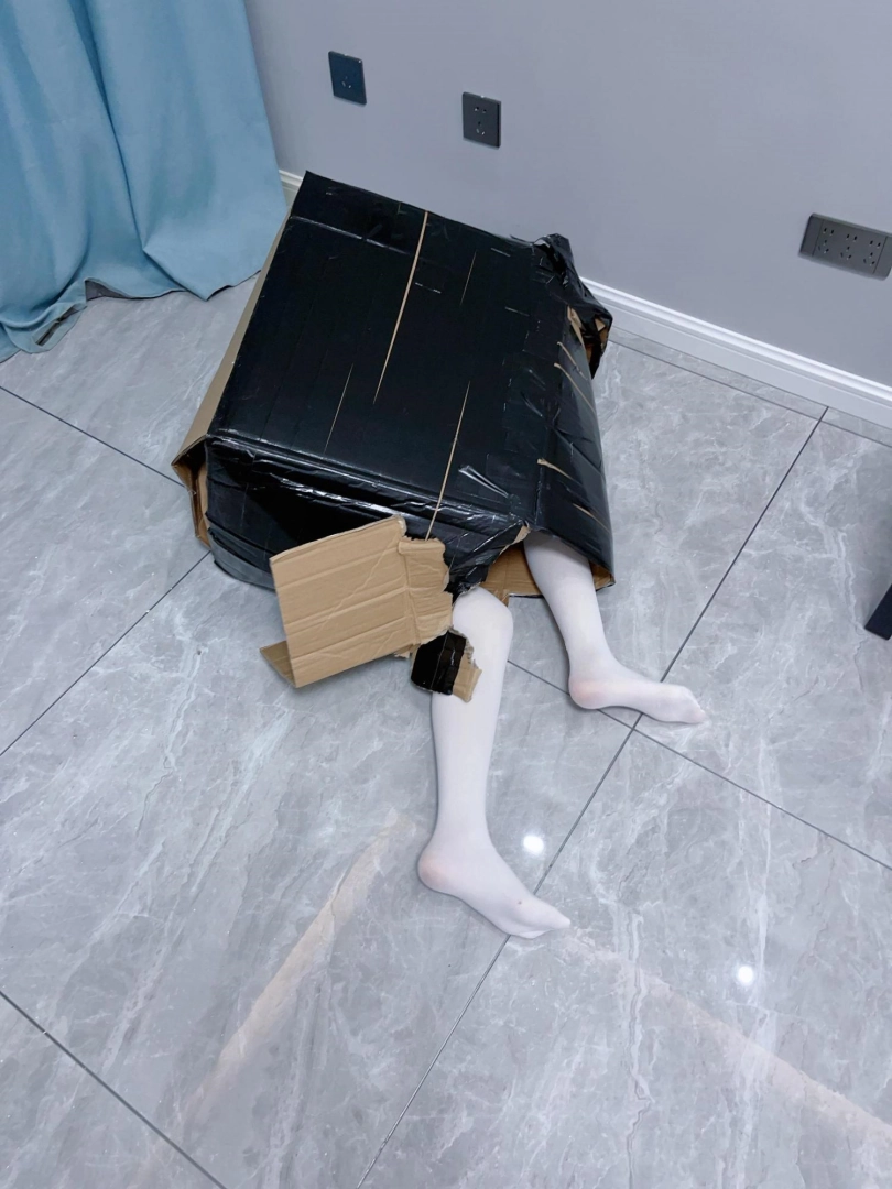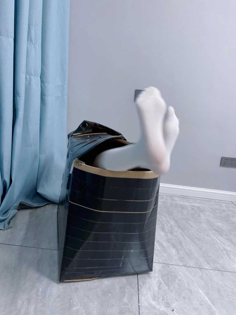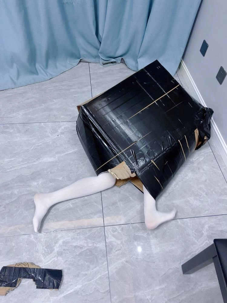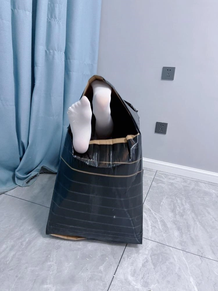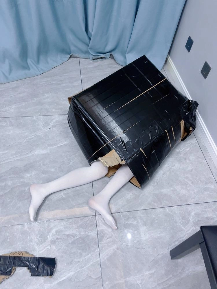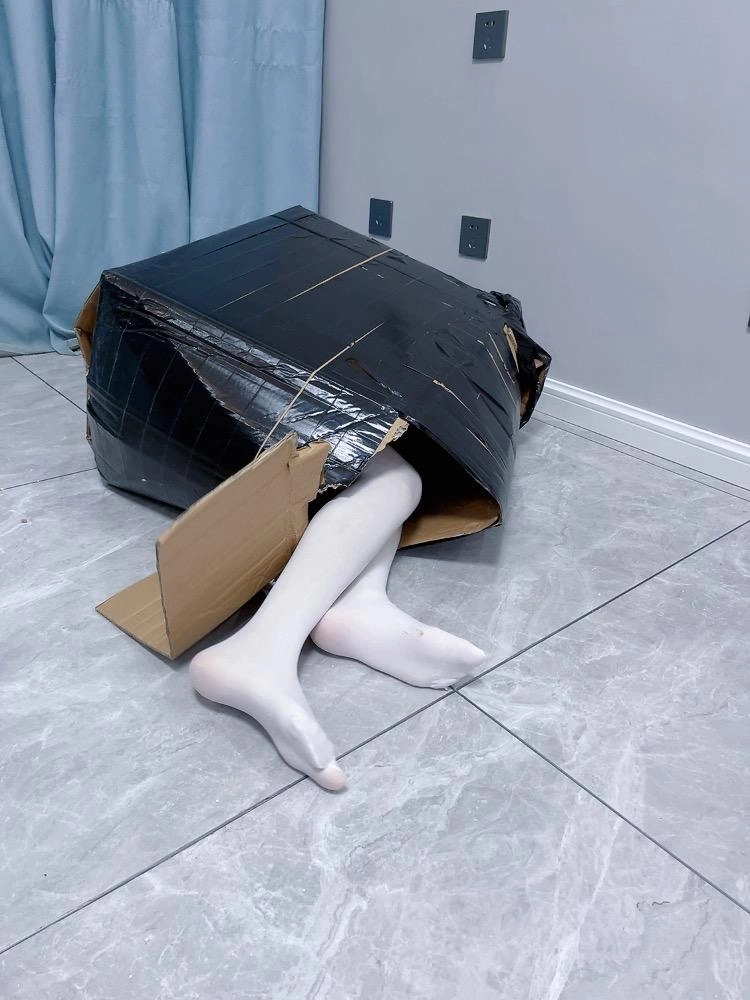 因为茶茶已经有过一次经验了,所以这次不给茶茶任何工具、双手反绑、手指也用胶带缠成拳头,让茶茶只能靠自己的白丝小脚踹破箱子脱出。
