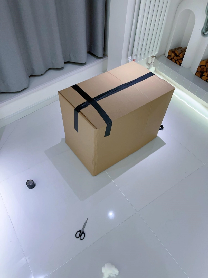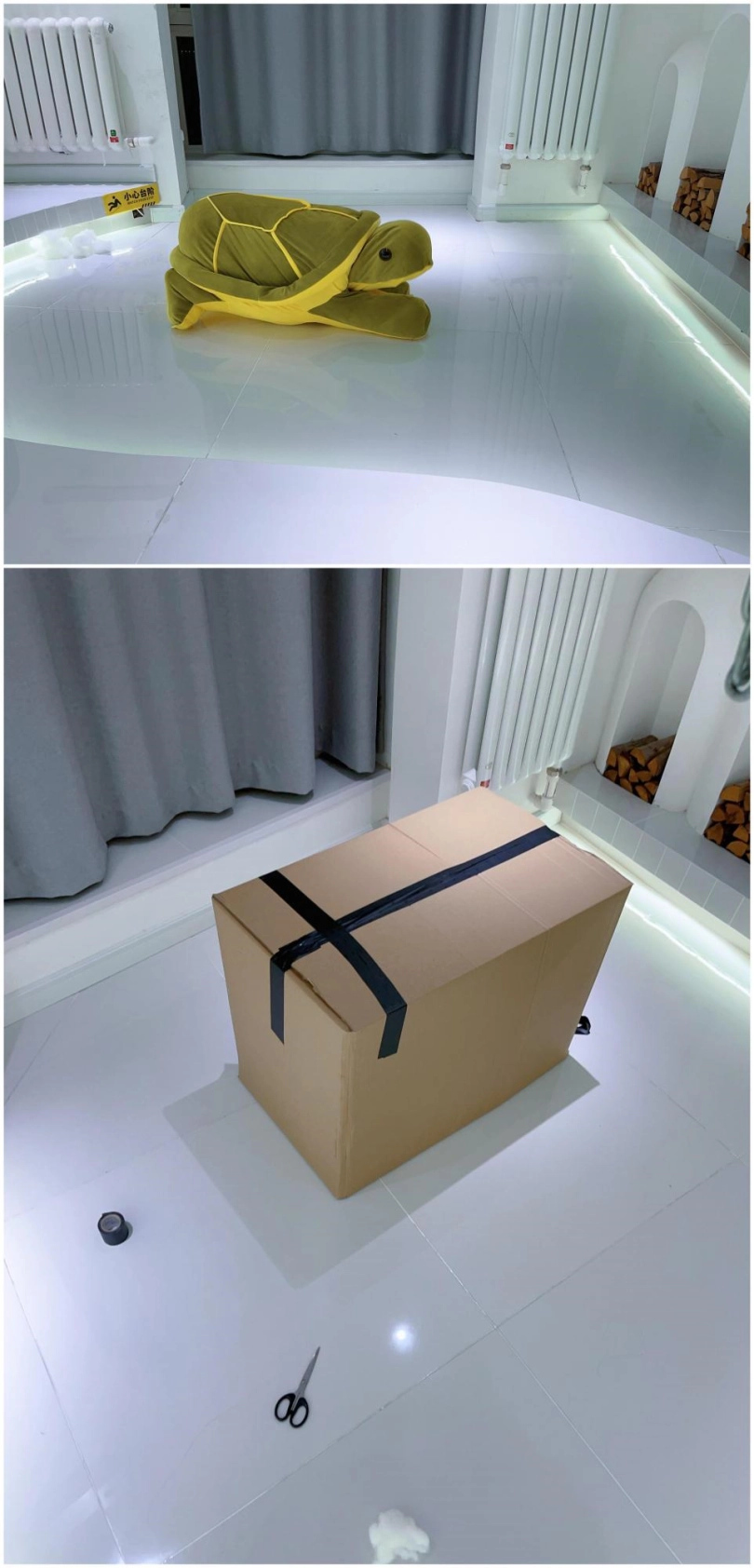 part3:把打包好的小乌龟侧放入箱子后用胶带封好,旋转放置使内部姿势混乱(头上脚下或其他位置,不知道箱子内方向),然后静静放置.....