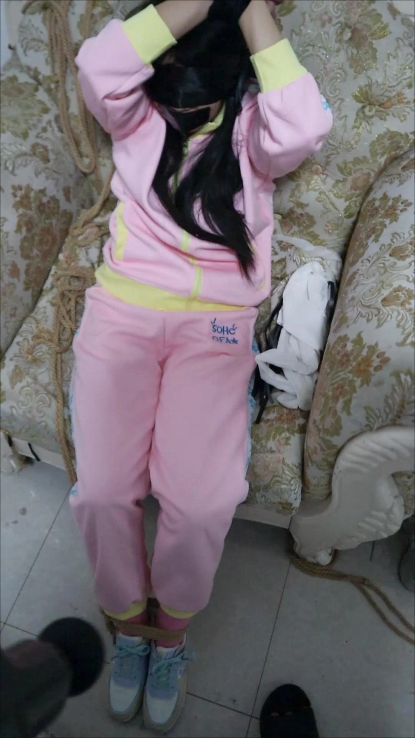 【荷仙少女】哪里来的粉色运动服姑娘,吊绑双手,捆住双脚 被一遍一遍的虐挠全身,啊啊啊的疯狂挣扎,然听见外面有声音,少女A直接贴胶带糊糊的喊出救命呀救命呀,结果被男主狠狠的捂住嘴,呜呜呜呜晕过去了
