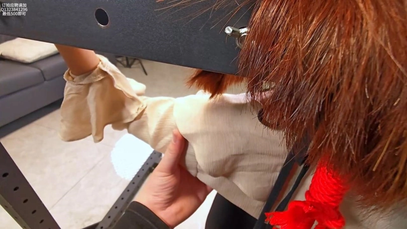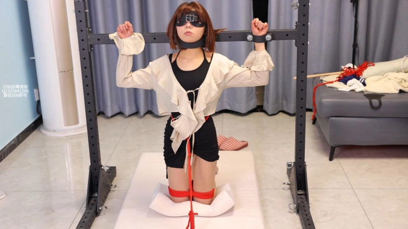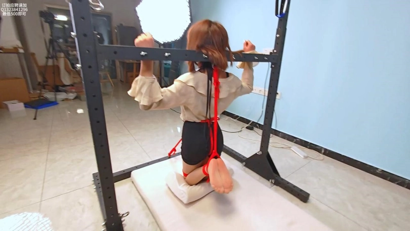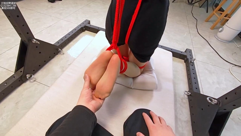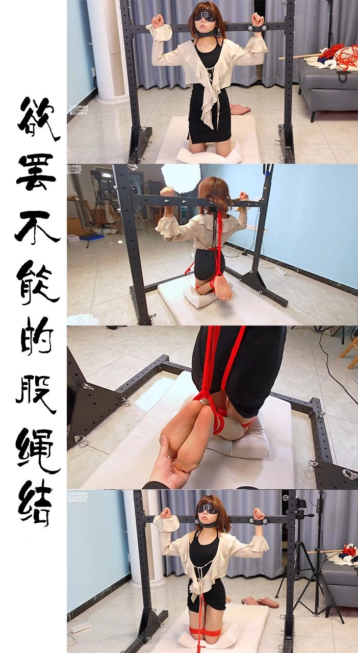 短发小萝莉被金属铁架束缚,跪坐在地,吊起双脚。中间用上好大一个绳结的股绳,连接在前面的固定出。TK时候一挣扎就会牵动下面的绳结。欲罢不能的感觉。
