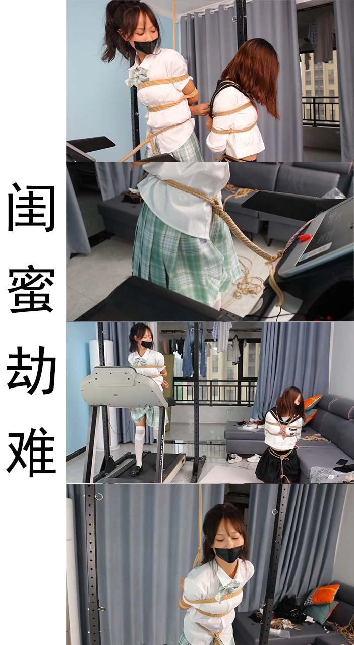 欢欢被坏蛋入室劫持,日式吊起,又用股绳连接着跑步机只能无奈的在跑步机上面跟着走。结果劫匪在屋子里什么都没有找到。气愤之下让欢欢想办法忽悠来她的闺蜜文文。文文一无所知的来到欢欢这里,结果立马中了劫匪的招数,被驷马拘束在地上,劫匪拿了文文的财务扬长而去。留下欢欢和文文在屋子里想办法解脱。文文想尽办法终于解开了连接脚踝和手腕的绳子。