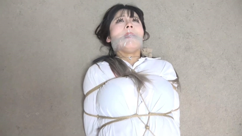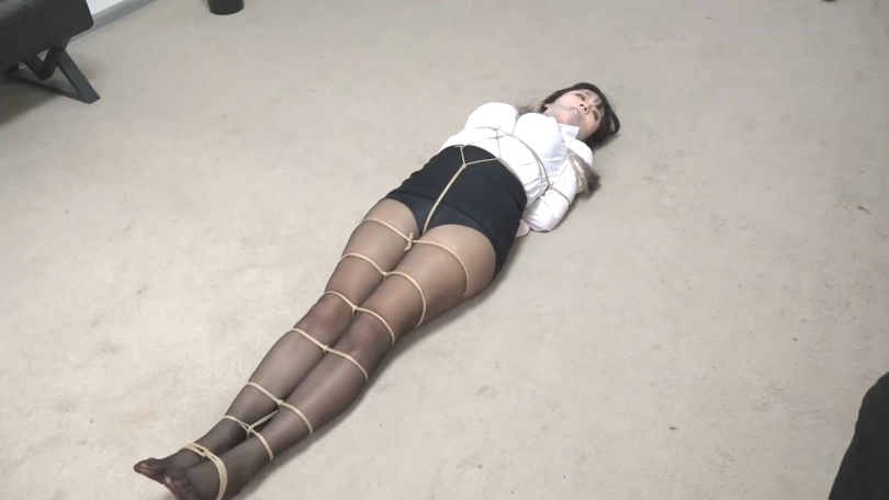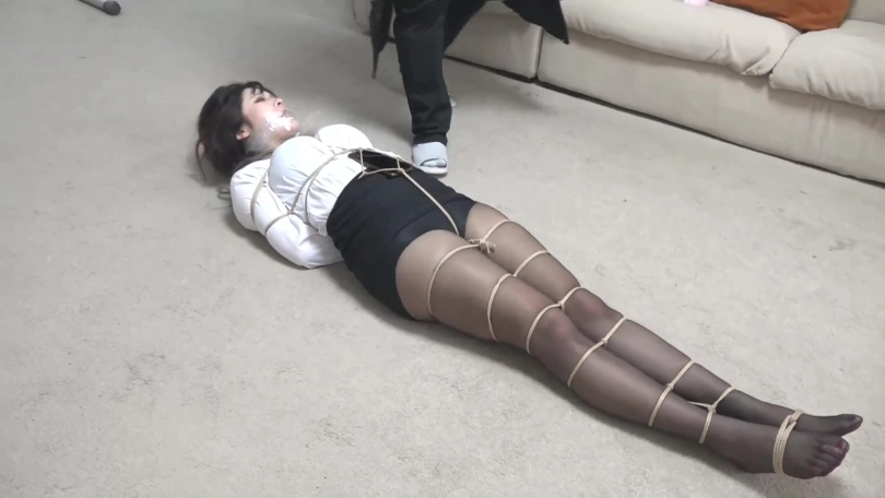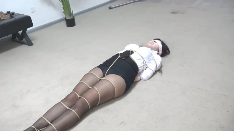 随手拿起一双丝袜从新蒙住美女的眼睛,然后跑了,留下美女在地上扭动挣扎。
