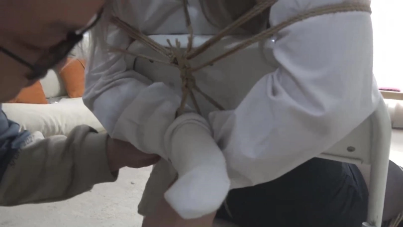 罪犯拿出纸条向她展示:要去拿取赎金,如果遇到意外,你就会被撕票,罪犯走后,美女努力挣扎,试图用手解开身上的束缚,再挣脱手部袜子时候被回来的罪犯发现