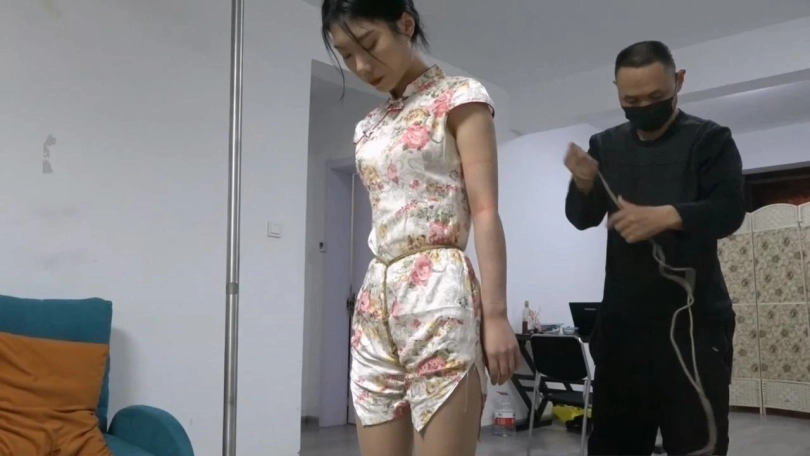 高冷颜值配紧身小旗袍还挺适合,配上中式五花紧缚就更适合了,标志的逍遥紧缚单脚吊,吊的模特一阵阵娇喘。