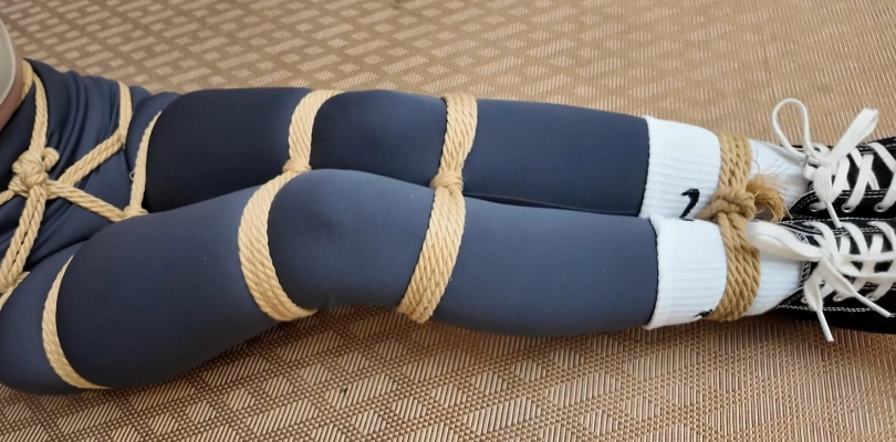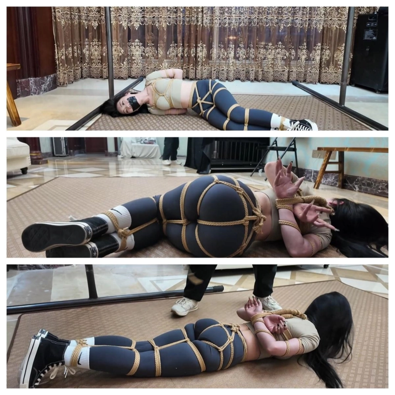 一小偷用万能钥匙入户盗窃,不料女主人突然回家,小偷做了一番思想工作后,决定埋伏起来,一不做二不休将女主人捆绑起来,劫财劫色,刚进屋的女主人哪里知道危险正在向她靠近,一进屋就被挟持,用刀威逼,接着被小偷反剪双手,押解着去家里寻找绳子,用自己家的绳子把自己五花大绑成大闸蟹一般,押着女主人找到绳子并命令她下跪,接下来到了小偷的表演时间,将女主人上半身五花大绑(这里强调要勒胸口),五花大绑让女主人本就丰满的胸脯更大起来,看着就让人想入非非,下半身捆上股绳(股绳的作用把臀部勒得非常丰满),双腿脚则被捆绑了四道,大腿根部,膝盖上下及脚腕。捆绑结实以后,小偷让女主挣扎,女主只能扭动绳子进行挣扎,可这都是徒劳的,一个被绑成大闸蟹般的弱女子怎么能挣脱开束缚呢?接着小偷用一块厚毛巾塞入女主口中,接着用5张布基胶带黏住嘴巴,女主这些只能发出呜呜呜的声音了。捆绑堵嘴完毕,小偷还不放心,用一根长绳子把女主驷马倒攒蹄捆绑,再拉紧绳子让女主上半身翘起来,被驷马倒攒蹄的女主只能在地上呜呜呜呜并蠕动身体,见女主被如此捆绑后,小偷才放心去房子搜索值钱的物品。客厅里的女主见小偷进房间后,挣扎着,蠕动着往门口爬去,这对她来说很难,驷马倒攒蹄让女主的没移动一厘米都发出呜呜呜呜的声音,女主努力着快移动到门口时,小偷找到了银行卡从房间出来,看到将要跑到门口的女主后恼羞成怒,把她拖回了客厅中央,然后用刀威胁她并逼迫她说出银行卡密码,女主为保命只得老老实实说出密码,问询到密码的小偷并不像离开说到:既然你想逃跑那就惩罚惩罚你,哈哈。