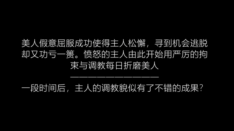 美人(柳洋饰)假意屈服成功使得主人松懈,寻到机会逃脱却又功亏一篑。愤怒的主人由此开始了对女奴的严厉拘束调教。