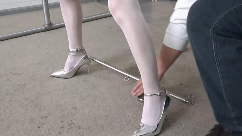 女奴双脚被一字枷分开拴住,双臂被单手套缚紧后高高拉起系在架子上。被放置在空旷屋内的女奴不时哀鸣挣扎。