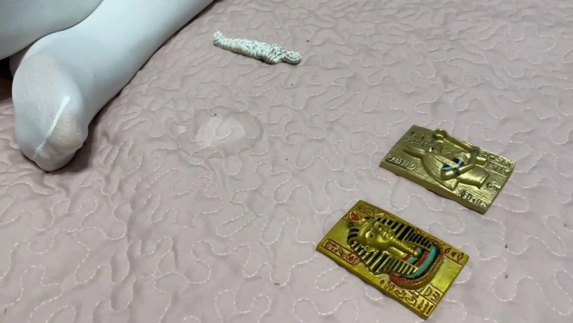 最后吴晗全身都被绷带包裹了。从脚到脖子全部包裹了。头上也加上了头头饰。吴晗更加惊慌了,她这时发现自己被捆绑的姿势和纪念品一模一样,这是才确定真的被纪念品诅咒了。一阵后悔早知道就不弄金字塔里的文物了。