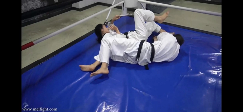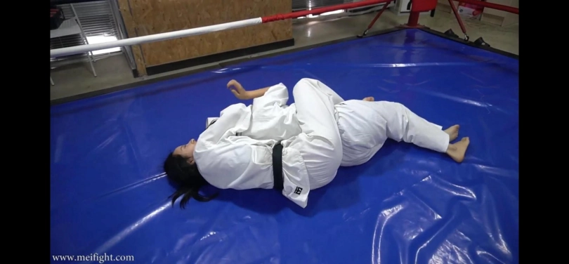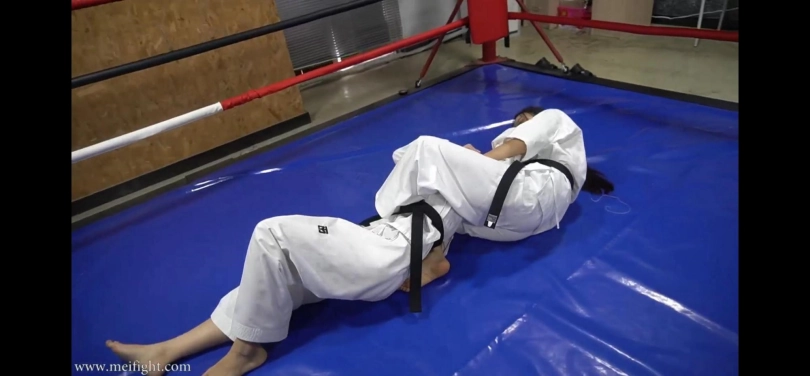 两个跆拳道女孩以为琐事大打出手,互相蹂躏对方,摆出各种羞耻姿势,最终一个女孩被打晕倒在地上。