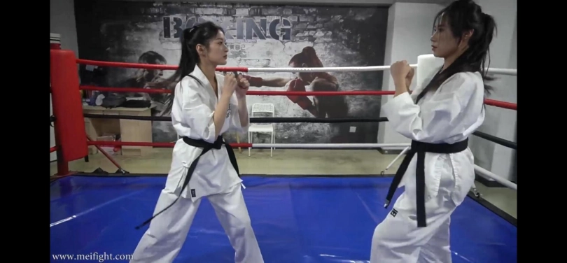 两个跆拳道女孩以为琐事大打出手,互相蹂躏对方,摆出各种羞耻姿势,最终一个女孩被打晕倒在地上。