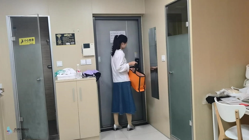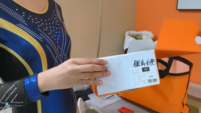 男子假扮快递员手捧纸箱来到模特门前,将一个包装精美的礼物盒放进纸箱后,按响模特家的门铃。模特是一名体操选手,正在家中等待新买的体操服送到,听到门铃声后确认是快递员,打开房门从男子手中接过纸箱,向男子致谢后关上房门,打开纸箱取出体操服,开始拖去衣物开始试穿,换上体操服和裤袜后,模特在穿衣镜前抚摸身体检查,对服装非常满意。
