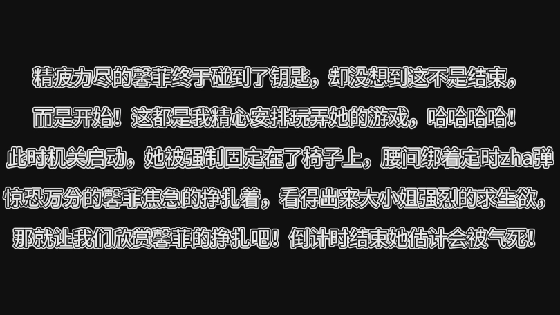 此时机关启动,她被强制固定在了椅子上,腰间绑着定时zha弹惊恐万分的馨菲焦急的挣扎着,看得出来大小姐强烈的求生欲,那就让我们欣赏馨菲的挣扎吧!倒计时结束她估计会被气死!