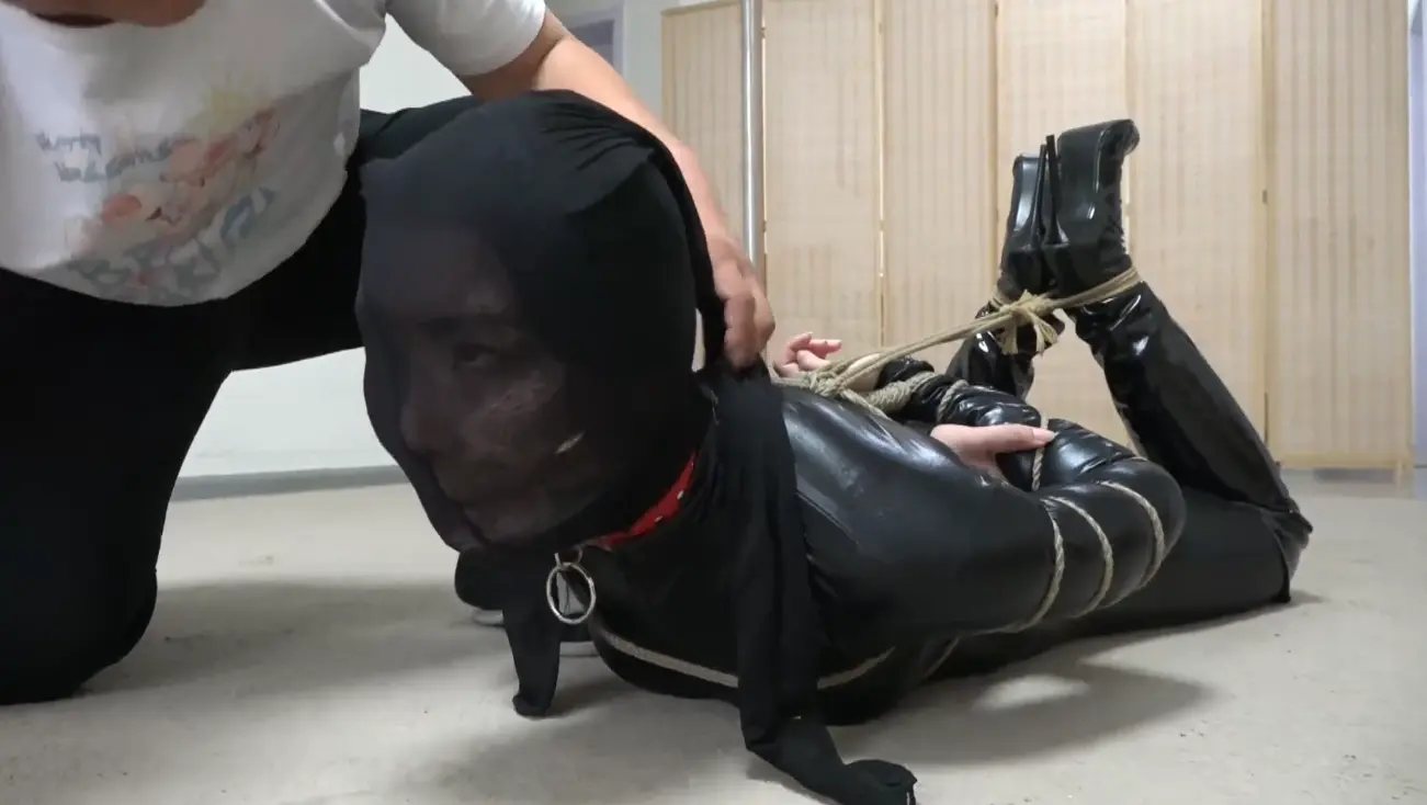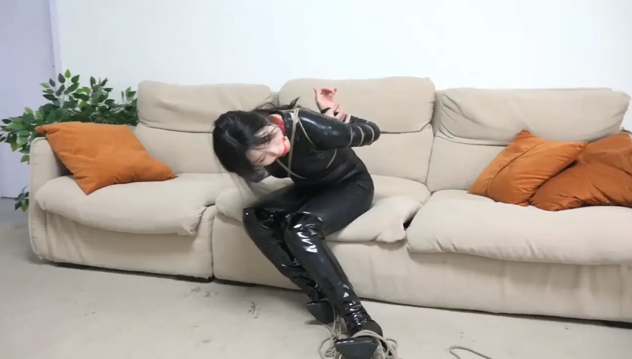 女贼被留在客厅独自挣扎,很快绑住脚踝的绳子就被弄松散开,但上身的拘束实在太紧,于是她决定在屋子里四处找找有没有能够帮助脱缚的东西。搜寻一番无果,女贼来到大门口碰碰运气,却正好遇到了回来的男主人,被拽着项圈押着人往回走去“还想跑?看来就是捆的不够严实啊 回去看我怎么收拾你!”最终我们可怜的吴晗被捆着押回了房间,这回她被捆了给严厉的驷马,口球上缠了几圈胶带,被丝袜蒙头,只能绝望的呜呜挣扎着...