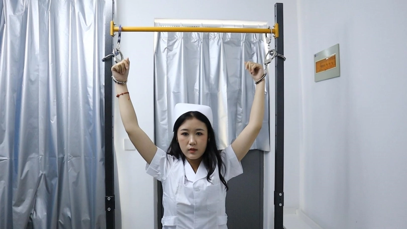可儿换上护士服小白鞋,真挺有护士的感觉,本想控制精神病人,结果病人逃跑,还被反杀,被病人用磁力绑带绑在了床上,然后手脚枷紧固,最终四肢分开“火”字形吊铐起来,动弹不得哈哈哈!!!