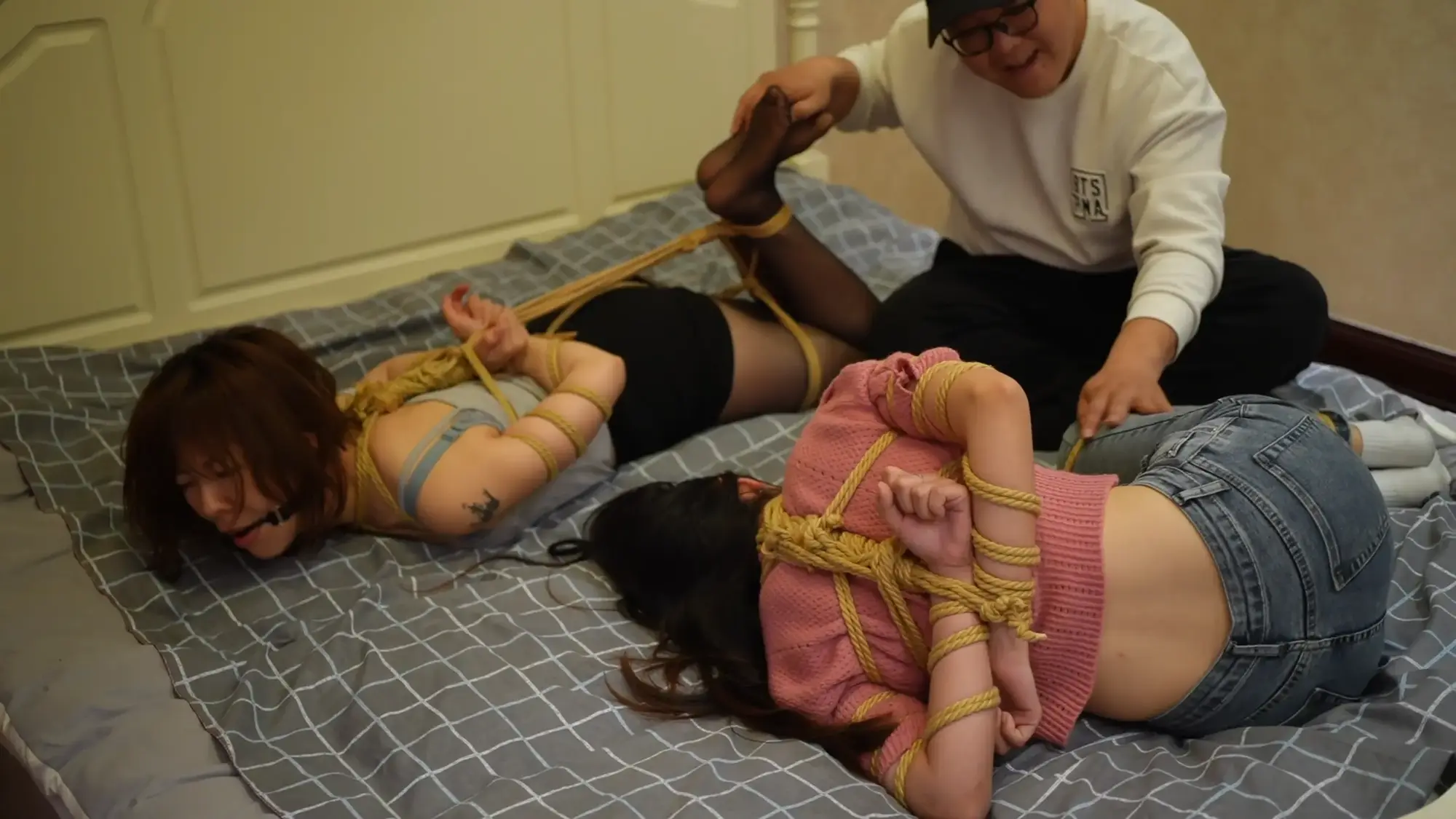 片刻过后,被五花大绑的母女两人苏醒,小智呵斥房东放开她们两人,米粒告诉了小智实情,小智大骂房东是趁火打劫。愤怒的房东将小智的头按在地上,准备好好教训下她,米粒求情放过小智,房东为了让小智知道厉害,将她桃缚防止乱动,并当着小智的面玩弄米粒,小智不停挣扎倒在了地上,房东又将她并腿团缚,继续玩弄米粒,被丝袜堵嘴的小智只能在一旁眼睁睁的看着。