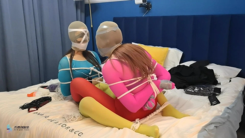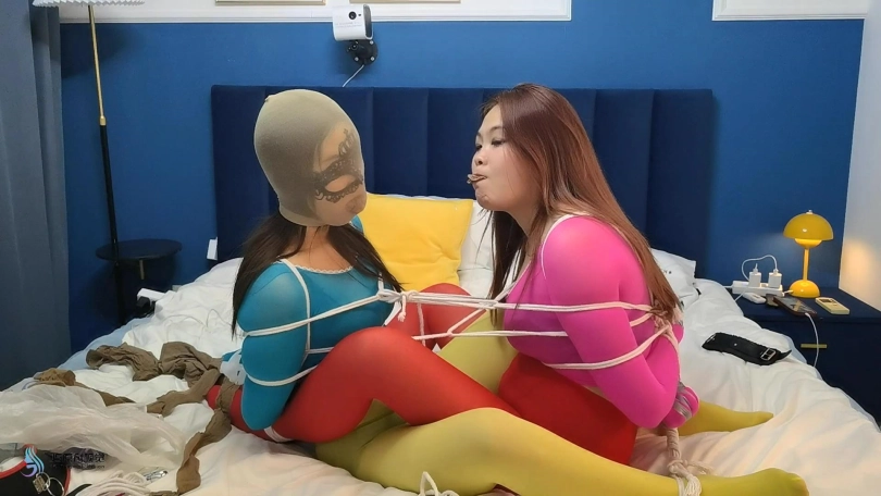 两人身上穿着五颜六色的丝袜,用胶带将她们的手缠绕,嘴里塞进丝袜,再套上丝袜头套,外面用胶带缠绕封堵,防止她们将丝袜吐出来。让她们的双腿彼此交叉,这样能使她们靠的跟进。用绳子将她们捆绑好,两人身体也被绳子绑在一起。然后给她们脖子上戴上项圈,并用铁链链接项圈,缠绕她们的身体。这样就使她们面对面的绑在一起。胸部放进去TD,刺激着Ru头,用快乐棒调到最大马力,持续不断的刺激着她们的敏感地方。很快她们身体开始抽搐起来,达到GC。