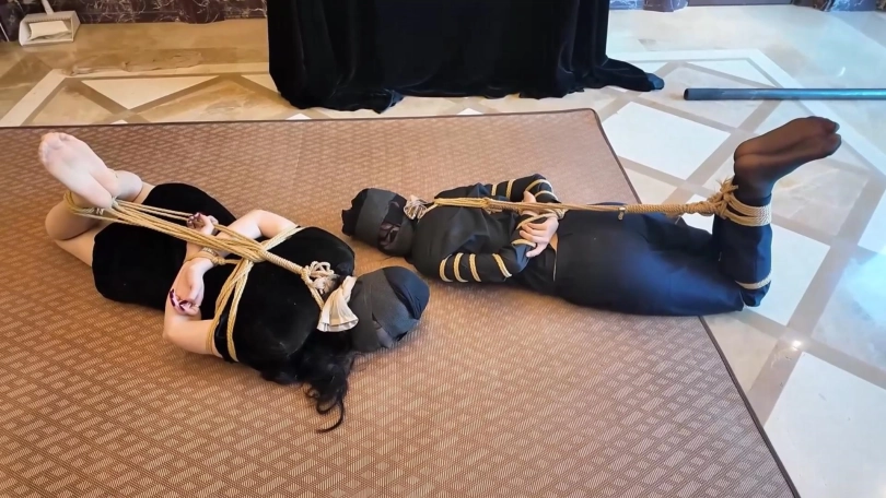 很久后,在一个密室里,保镖被绑在柱子上,富家女被绑在椅子上。她们二人的头依然被丝袜套着,捆绑囚禁。绑匪告诉她们不会有人来救她们,因为追踪器的信号早被屏蔽了。