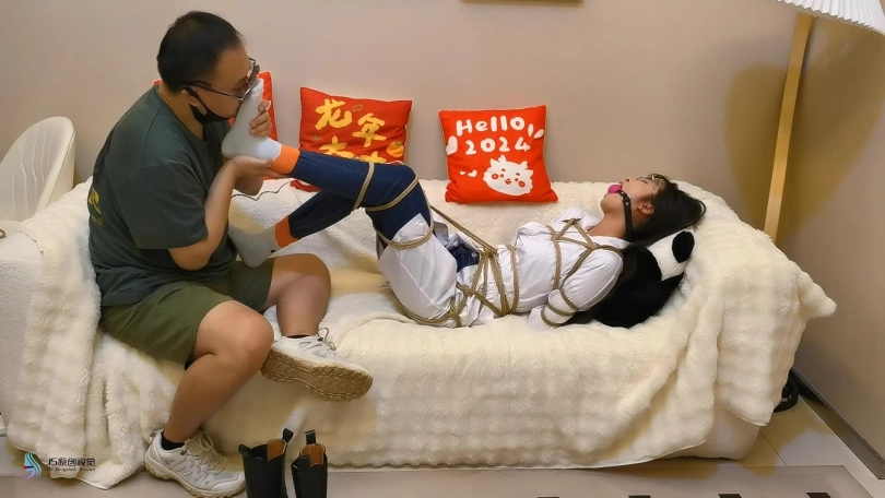 当镜头再次亮起时,我们发现女医生全身都被绳子紧紧的捆绑着躺在床上,她的嘴里备塞进了一个大口球,这让她无法说话。患者来到医生面前,训斥着女医生的种种行为。患者好奇女医生经常给别人看病,不知道自己那方面是否敏感,决定上手替医生检查下。患者解开女医生脚上的绳子,将她的靴子脱下来,一双穿着白棉袜的脚丫看着很可爱。患者捧起女医生的一直脚开始亲吻,另一只脚放在自己的下面,让医生的脚为其按摩。随后患者拿出棒棒,对着医生下面就是一顿疯狂输出,很快女医生就发出很享受的呻吟声。。。