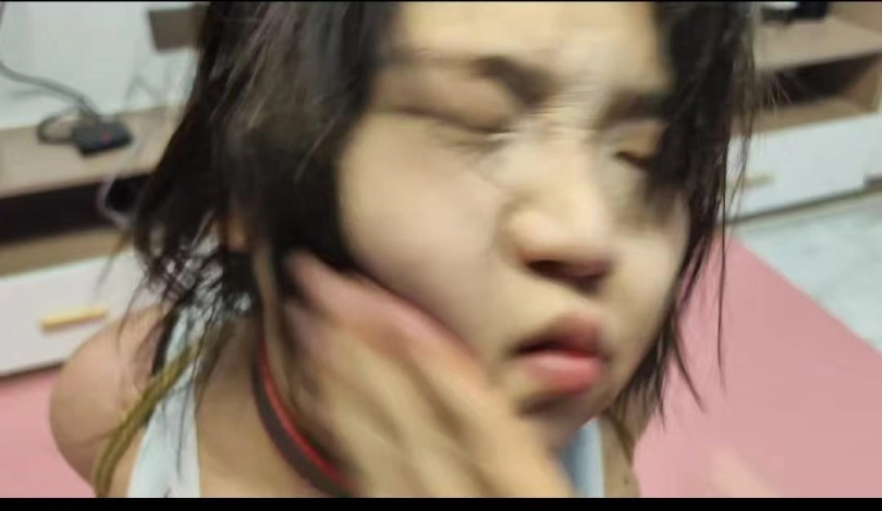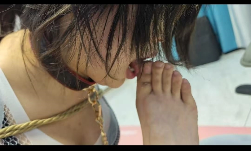 小文一身白丝被紧缚调教,最后还有神秘男子享受小文胸部蹭腿福利,大力揉胸,耳光把脸都打变形了,眼泪不由自主的流了下来,享受着屈辱的同时一边接受着下一步的调教。