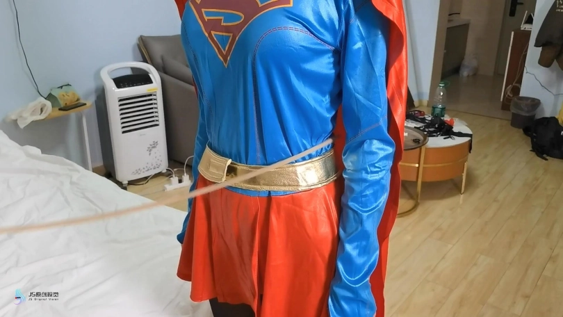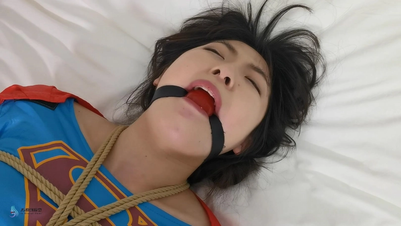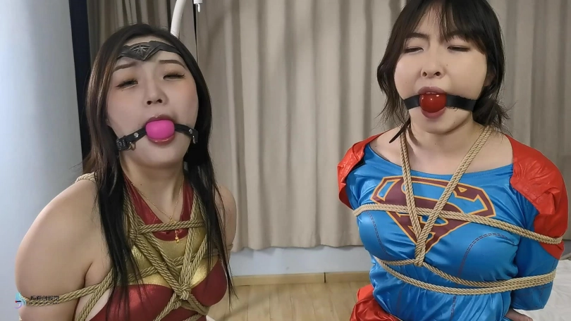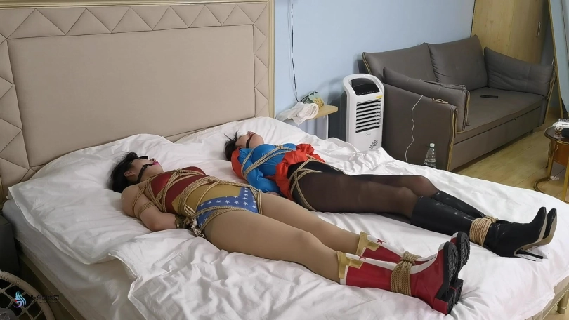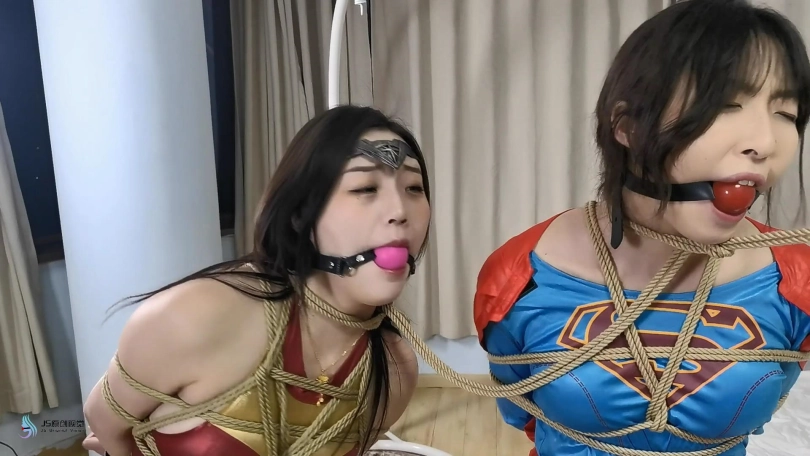 近期本市频发少女失踪案,联盟派出神奇女侠和女超人潜入可以房间调查,就在她们在房间内调查时,房间里突然窜出多条绳子缠住了女超人。神奇女侠过来帮忙,但也被绳子缠住。很快她们就被绳子牢牢的捆住。就在她们想要呼叫支援时,绳子缠着两只口球塞进她们嘴里。被被绳子牵引到床上。为了防止她们逃脱,绳子又将两个电动跳D塞进她们的裆部,强烈的刺激感让她们无法使用全部力量挣脱束缚。经过一段时间的努力,她们互相解开了彼此脚上的束缚,和嘴里的口球。但她们无法挣脱上半身的束缚。她们决定先逃出去再说,就在她们刚走到门口时,画面里传出了她们哀嚎声。