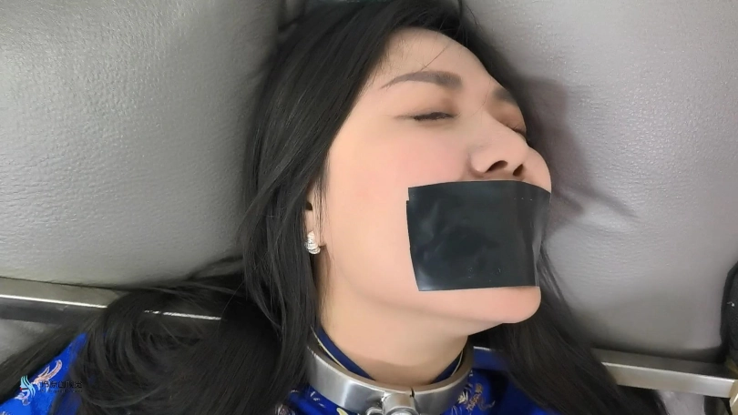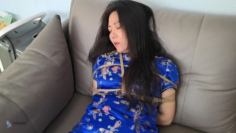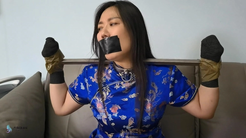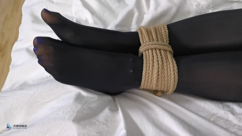 女主双手反捆,双手握拳缠绕胶布,绳捆胸部上下,膝盖。省略过程,画面出现时绑好。