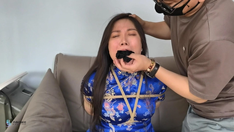 女主苏醒呼救,歹徒将丝袜塞进女主口中。黑色胶带封嘴。