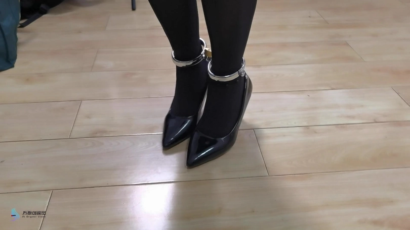 穿高跟戴足铐,屋内行走。期间歹徒打屁股、推搡。
