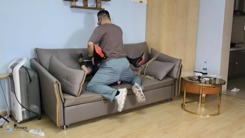 床或沙发上,女主佩戴颈手枷(手指胶布缠绕、胶带封嘴不变),双腿分开并折叠捆绑,维持鸭子坐姿势。对腋下、脖颈、腰、脚或任意部位挠痒。