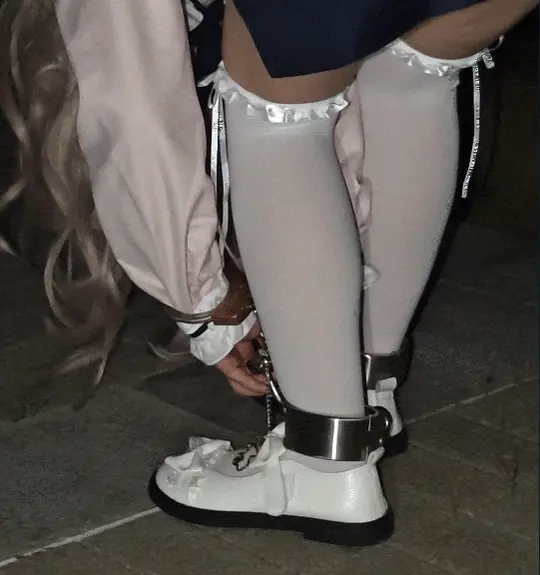 今天,大一新生苏苏刚考完期末考试就迫不及待的想穿上新衣服戴着镣铐去户外游玩,于是我带着她来到了一个人迹罕至的公园,公园旁有零零散散几户人家,旁边的运河不断有船舶略过,苏苏穿着崭新的JK,戴着猫耳楚楚动人,叮叮当当的连体镣铐伴随着轻快的脚步在公园里回荡,可谁知转角遇到爱,与一位散步的大叔撞了个满怀,戴着连体铐的苏苏被一览无遗。大叔虽有些疑惑,但还是继续遛弯了,苏苏吓得一动不敢动,毕竟这身打扮太显眼了,走了一段路后,大叔又折返了回来,想必是发现了不对劲,苏苏赶紧逃离现场,坐到了长椅上揉着被脚镣禁锢麻了的双脚,还处在被发现的惊魂未定之中......