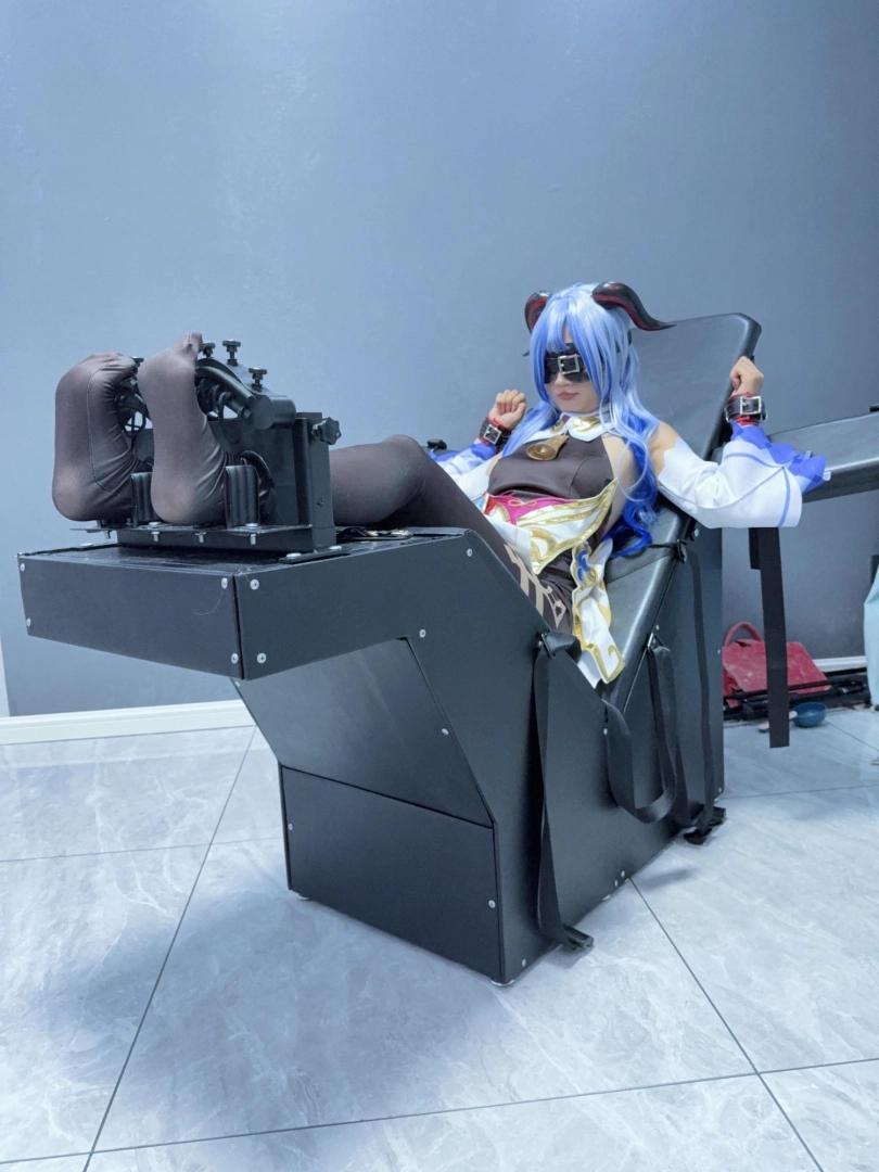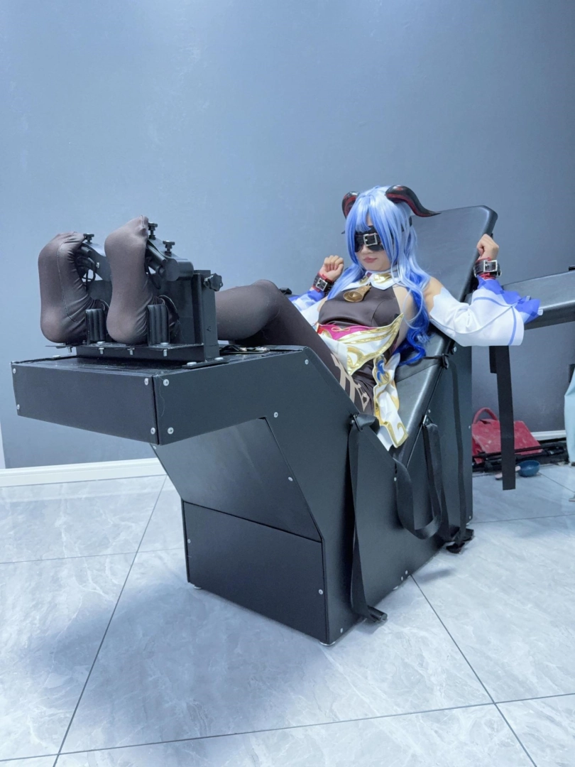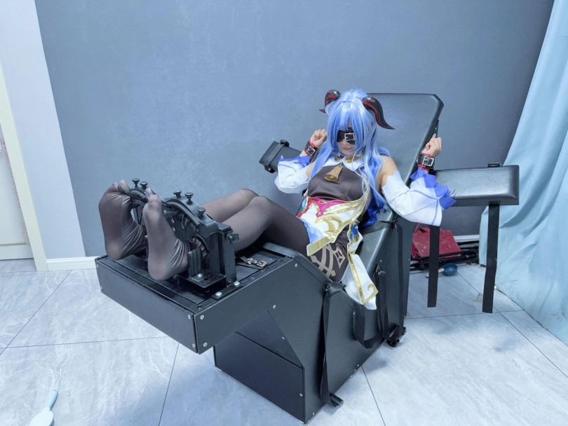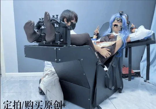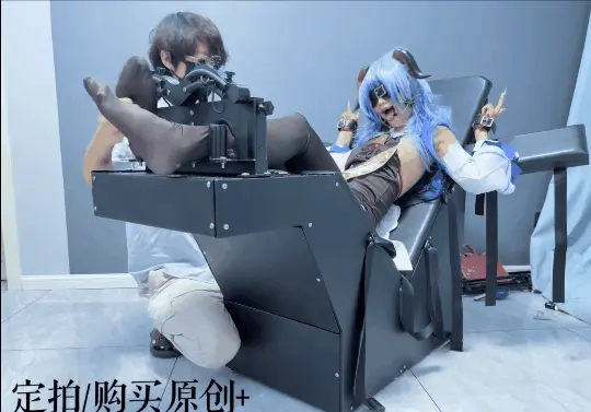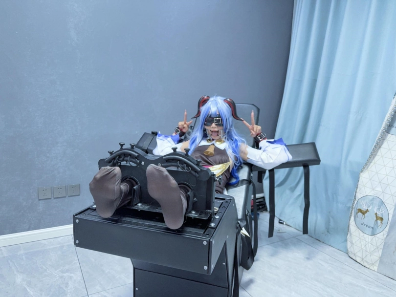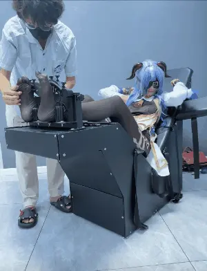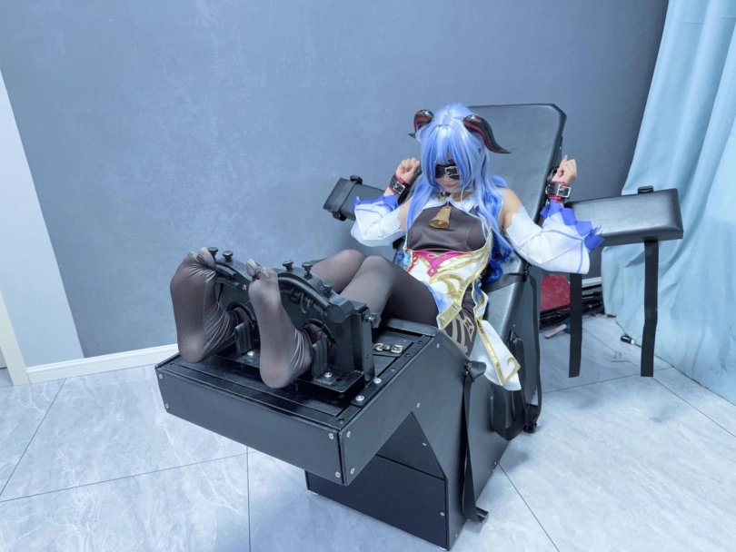 场景2:用足枷固定脚趾,因为穿了甘雨Cos服的原因,黑丝印花袜只能固定大脚趾,进一步开发脚底。用梳子狂刷脚底。