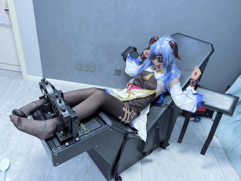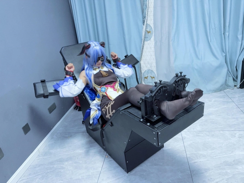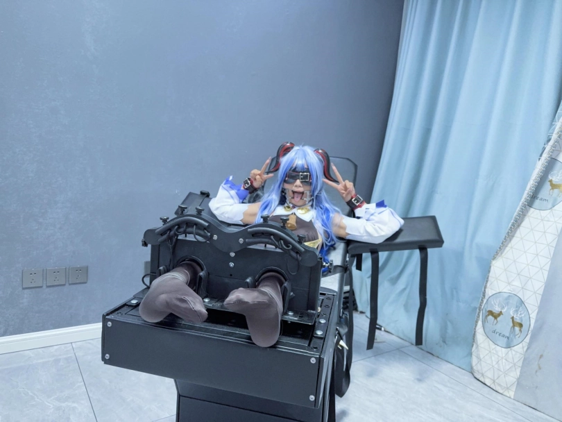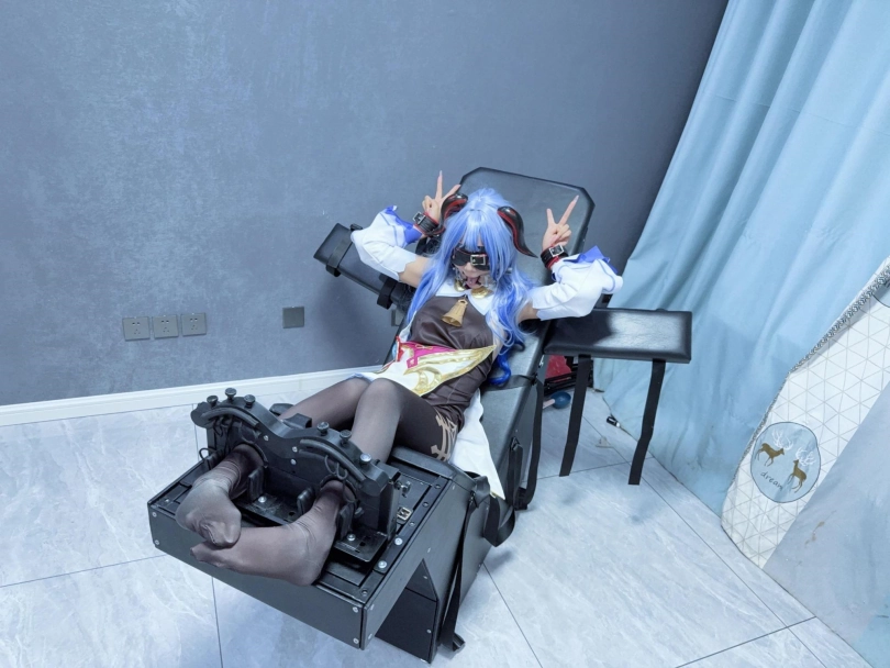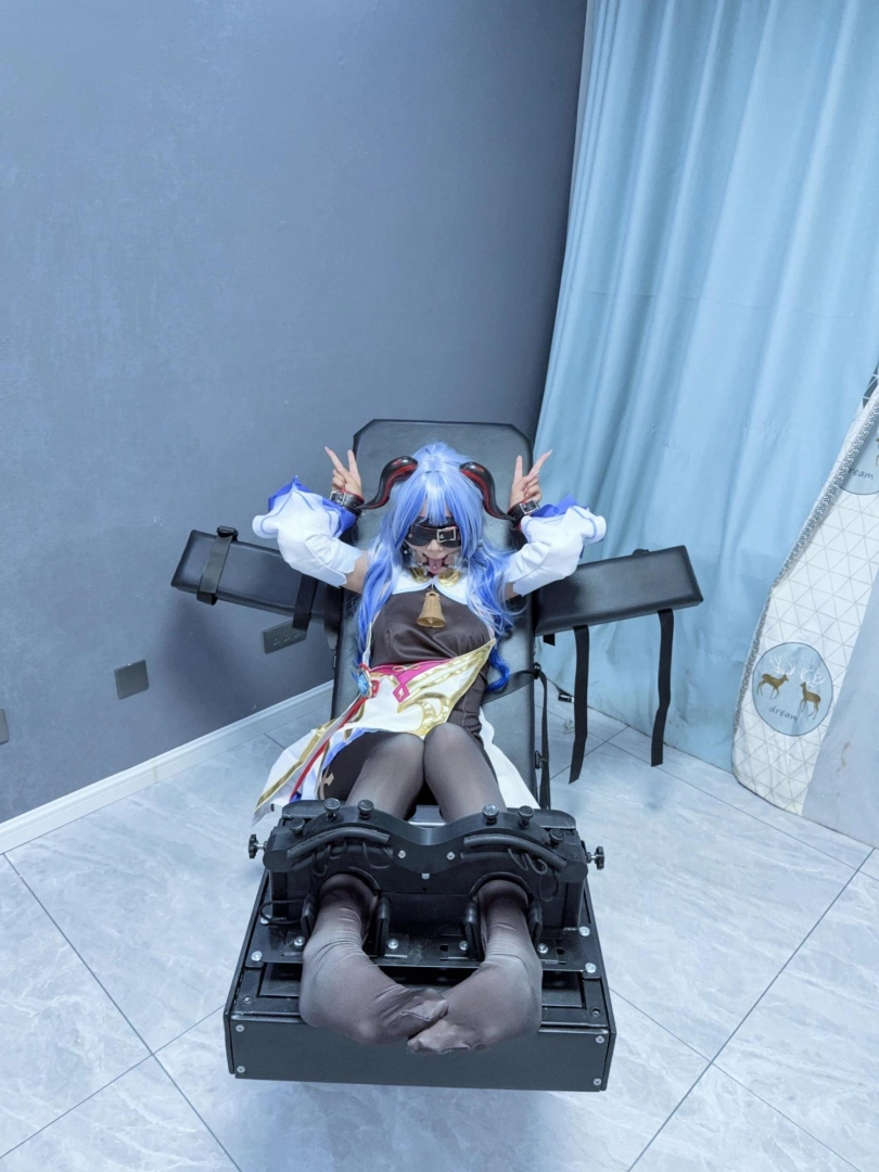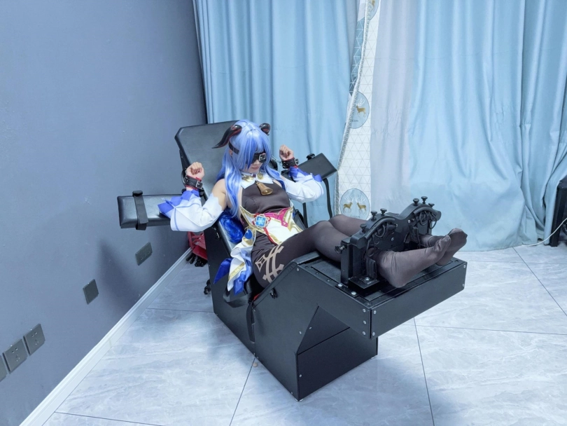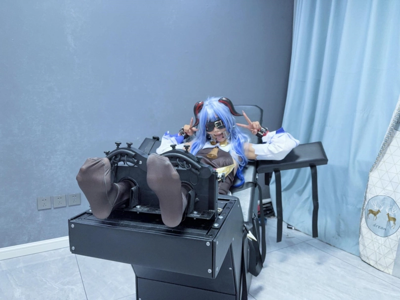 场景2:用足枷固定脚趾,因为穿了甘雨Cos服的原因,黑丝印花袜只能固定大脚趾,进一步开发脚底。用梳子狂刷脚底。