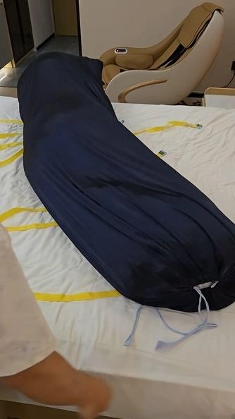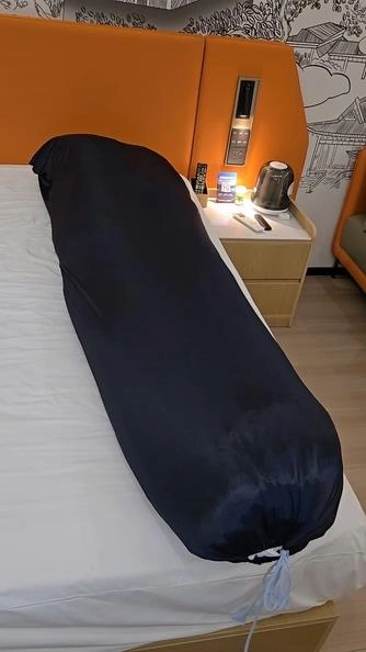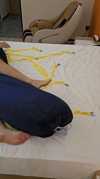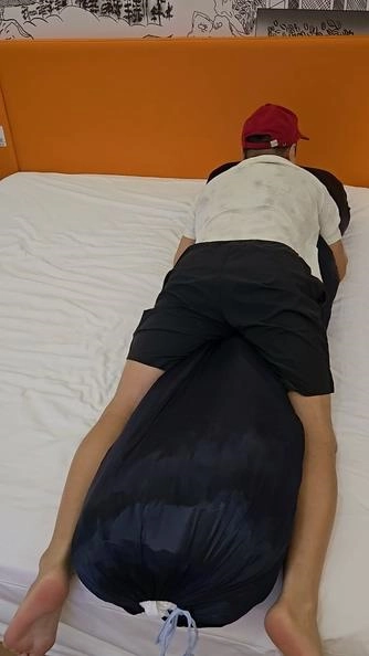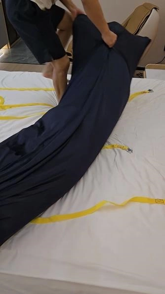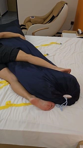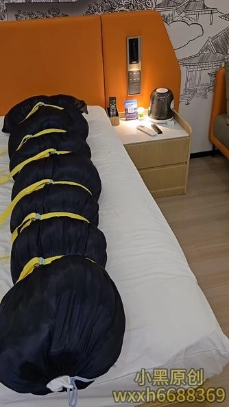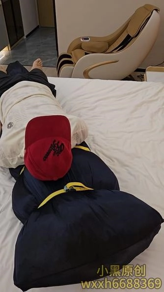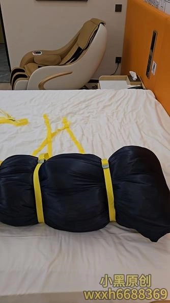【小黑】人形抱枕,棉被包裹木乃伊,再装进丝袋,系上口,再用绑带绑紧,里面有棒棒强高,压她,挠脚心疯狂叫放我出去!