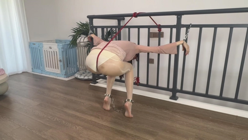 这次给欲梦体验了一次站也不行,蹲也不行的姿势,脖子那绑了绳子,只能半蹲的姿势,如果想站起来或者蹲下,脖子处的绳子会限制着她,