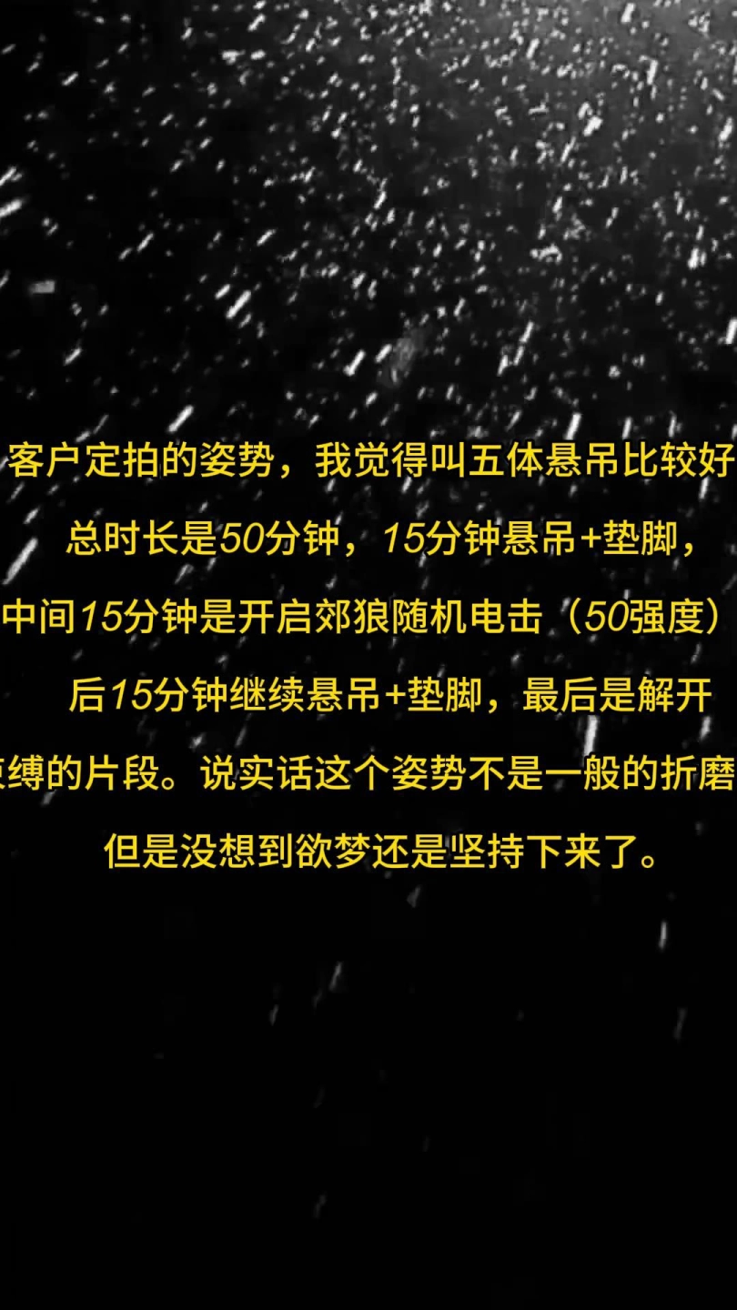 15分钟悬吊+垫脚,中间15分钟是开启郊狼随机电击(50强度),后15分钟继续悬吊+垫脚,最后是解开