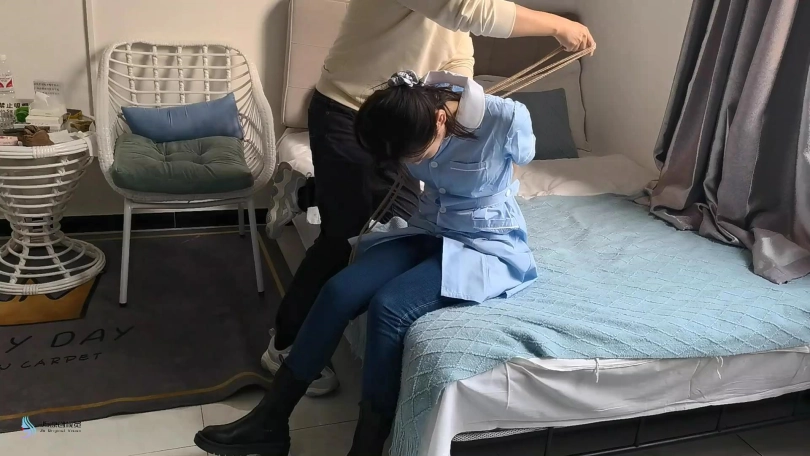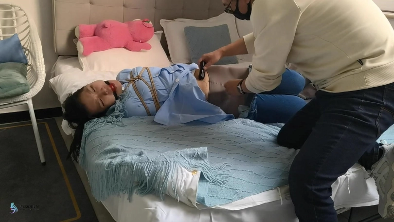 绑匪接到一个绑架女医生的任务。他伪装成病人去接近女医生,趁对方不注意,用喷过药的布捂住了女医的口鼻,对方只是挣扎了几下就安静下来。男人将女医捆绑起来,嘴里塞上口球。当女医醒来后,男人将女医的靴子脱下,让她趴在床上,紧紧的绑了个驷马的姿势。为了消耗女医的体力放置逃脱,男人扒掉女医的裤子,在裆部塞上一个TD持续震动。女医被刺激的发出呜呜声。