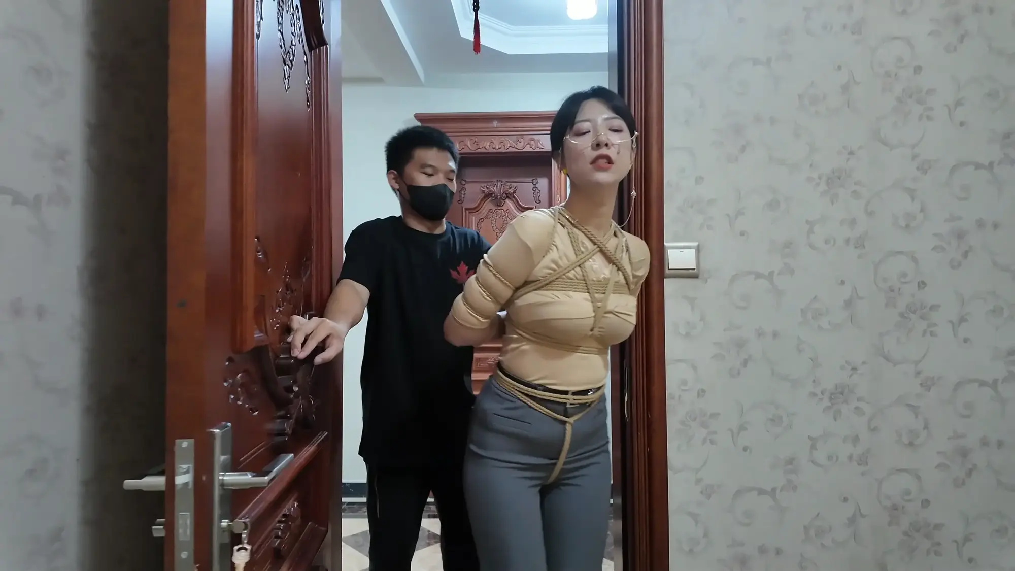 画面一转,e小姐出场(米粒扮演),她提着箱子边走边接起电话,电话另一边的老大命令e小姐拿到获取后就把卖家干掉,e小姐轻蔑一下说一定完成任务。e小姐与小弟会面,被小弟带上了楼。刚刚走进屋子,e小姐就察觉到了不对劲,并让躲在角落里的人出来。随后大哥拿着枪走了出来,夸奖e小姐是个狠角色并且还是个大美人,e小姐表示他们胆子不小敢黑吃黑,并告诉他们如果让自己的老大知道他们怎么死的都不知道。小弟不耐烦的让e小姐放下箱子,双手背后站在一边。e小姐淡定自若的照做,并用充满挑逗的口气说不开枪杀了自己,摆这个姿势是不是要绑。小弟验完钱后大哥回应e小姐本来是准备一枪干掉她的,但实在舍不得杀掉眼前的大美人,于是大哥命令小弟拿绳子去,将e小姐紧密捆绑了起来(捆绑过程全记录),捆绑的过程中e小姐不停挑逗眼前的两个男人,把两个人迷惑的神魂颠倒,但为了保险起见,大哥先让小弟把米粒关起来,慢慢料理她。