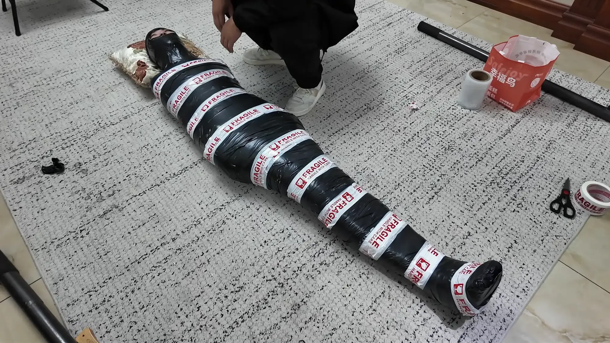 接着用剩下的pvc胶带把雨琦眼睛封住,就留个鼻子呼吸。雨琦非常害怕,不停的呼吸。然后客户将雨琦扛在肩上带走了。