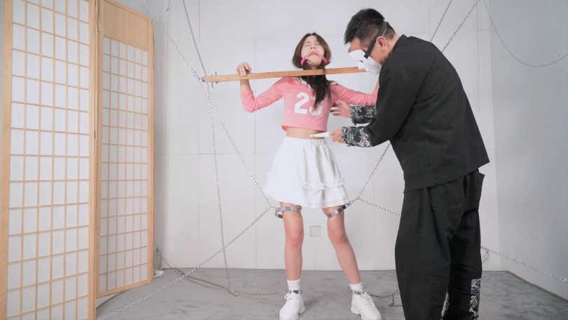 这个红色的足球宝贝的衣服本来是上衣加短裤,言妍自己搭配了一件学生气质的百褶裙,她这样一搭配,穿在她身上毫无违和感,加上白棉袜和加绒的运动鞋,这气质立马就出来了,把木枷吊起,腿上用了大腿铐,脚铐也用两根铁链限定了活动范围,言妍只能很小范围活动身体,这样放置简直太养眼了,经过TK、刺轮和电击器的攻击,她的呻吟声也激发出来了,对,就是我们喜欢的那个调调,又是声画俱美的片子!