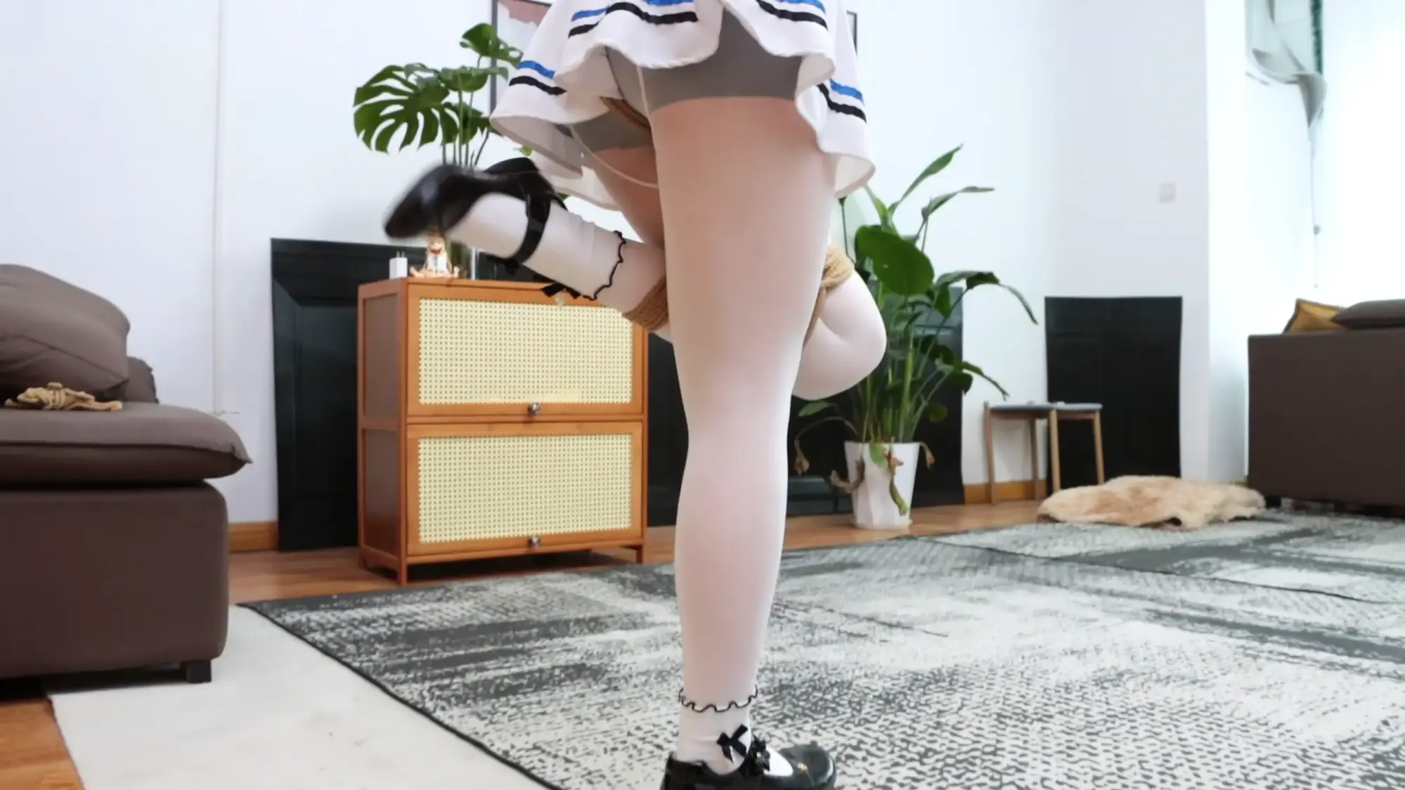 模特先单腿折腿缚在客厅内跳30个来回,坚持了18分钟。在很累的情况下再罚站半小时以上。模特看到的剧本只要罚站5分钟,但绑好之后就不给她解开了。模特快要急哭了。