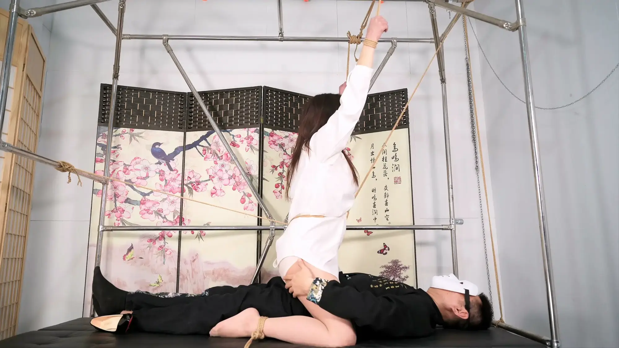 试过像这样睡觉吗,那一定要试一下,瞬间解决睡觉不老实到处乱滚的问题,手边还有能随时把玩的玉体,如果体验过一次保证上头。让我来说说怎么操作,当然首先要有个心仪的妹子,雪碧就是本人最喜欢的模特之一,我经常称她为宝藏妹子,总能挖掘出亮点;其次,我的只有想不到没有做不到的梦想之刑床派上了用场,没有可以墙上多打几个膨胀环代替,股绳前后固定,她就跑不了了,脚分开缚住脚腕,如果她不老实就在大腿加一道,但只绑住脚腕就好了,妹子跪长了膝盖受不了,随时可以抱住她的膝盖让她缓缓;最后就是躺在两腿之间enjoy了,躺下就不想起来了,有一刻仿佛进入心流状态,再往下就不能再演示了,想象是无限的。