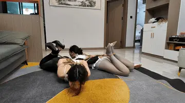 晓琴和十一被驷马捆绑,比赛看谁到终点,紧接着,十一后手观音,晓琴直臂捆绑,给十一带上双头口塞,让晓琴口,舌头舔的那叫一个仔细,画面香艳刺激,又被拉倒房间单腿双人缚,放置