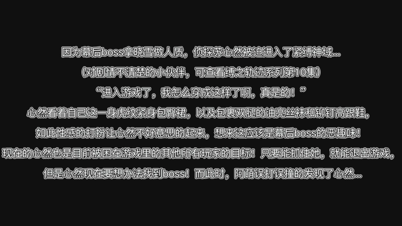 因为幕后boss拿晓雪做人质,侦探苏心然被迫进入了紧缚神域...(对剧情不清楚的小伙伴,可查看缚之轨迹系列第10集)