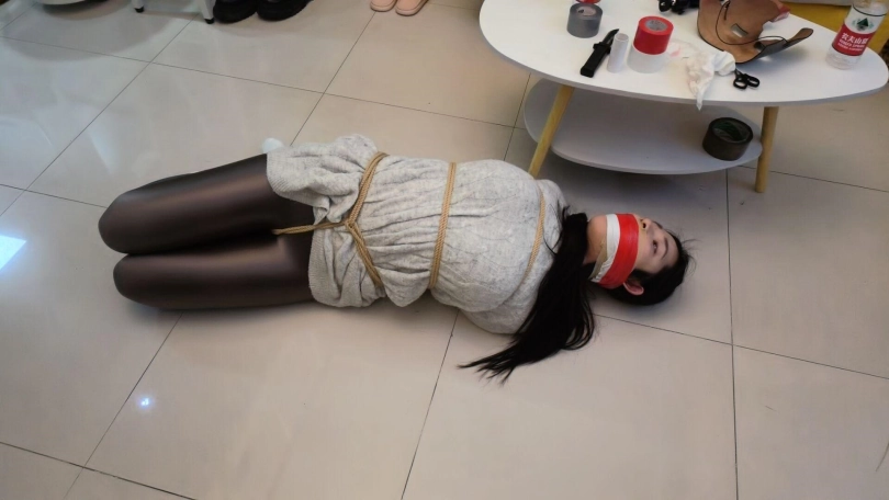 模特玖念。剧情介绍 近日J市出现多名女性失踪事件,记者玖念通过暗访调查,觉得一个高度可疑,为了让曝光事件,她决定去调查一下。玖念去调查,来到房间,她利用万能钥匙打开房门了,然后慢慢走了进去,来到客厅,发现桌子上摆满了绳子,胶带,于是说到:这绝对是犯罪地方,让我拍照取证。于是拿出手机拍照。正拍得起劲时,没有发现后面来的人,然后一双手捂住了她的嘴巴,然后把她摁倒在地上,玖念开始挣扎,坏人坐她身上,然后抓住她头发让她抬起头,接着用刀逼住她说到:胆子不小呀,送上门的小美女。玖念说到:我只是走错房间了,我啥也不知道。坏人说:给我老实点,先绑了再说,然后让她跪了下来,接着用绳子将她捆绑起,捆绑双手后,让她跪直,接着捆股绳然后再让她趴下,抓起双脚进行捆绑,捆绑完双脚后再进行驷马,将她捆成个粽子后,坏人脱下自己的棉袜,然后让玖念抬头,将袜子塞到她的嘴里,然后外面用橙色绷带封上,再用黄色胶带封上了。捆绑堵嘴完玖念后,坏人开始抚摸她全身,对她搜身,玖念趴着被摸全身,然后又给她翻个身摸脖子,胸和肚子,拉拉股绳。搜身中途玖念在挣扎并发出呜呜呜声音。坏人搜出了手机和银行卡,然后拍了拍玖念的脸,还拍了不少东西啊,我要去毁掉。然后离开,等坏人离开后玖念开始挣扎,左右挣扎,试图动手脚把连接手脚的绳子解开,剧烈挣扎并发出呜呜呜,一会解开了,然后她又坐起来挪动着往门口逃出去,准备到门口又靠着墙站起来跳着过去,在门口试图开门,这时被坏人然后用刀逼住她,让她跳回去,跳回原地后,坏人觉得绑得不够紧,有进行捆捆绑脱了她的靴子,再捆绑脚接着驷马,捆绑完毕后,解开她的嘴巴,让她张嘴,然后塞了块毛巾,觉得有空隙又塞了条丝巾然后用绷带缠绕,外面再用胶带封上,捆绑堵嘴完后,开始玩弄她,挠痒痒,还拉拉股绳,打屁股。玖念挣扎并呜呜呜呜,男主还说:想不到这女记者这么丰满,这会有好货了。还让玖念闻她的靴子,玩弄一会,坏人觉得累了,想要休息,但玖念可不行,得来个严厉捆绑,于是就给她绑了欧式直臂缚加驷马,捆绑完后,解开她的嘴巴,给她嘴里塞了豹纹袜子,然后又是绷带缠绕加胶带封嘴,捆绑堵嘴后,最后拍了拍她的脸和屁股说到:你给我老实待着。离开,留玖念在地上挣扎并发出呜呜呜声音。