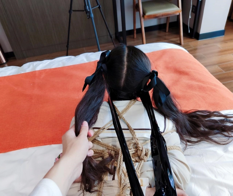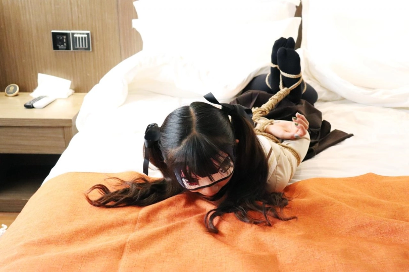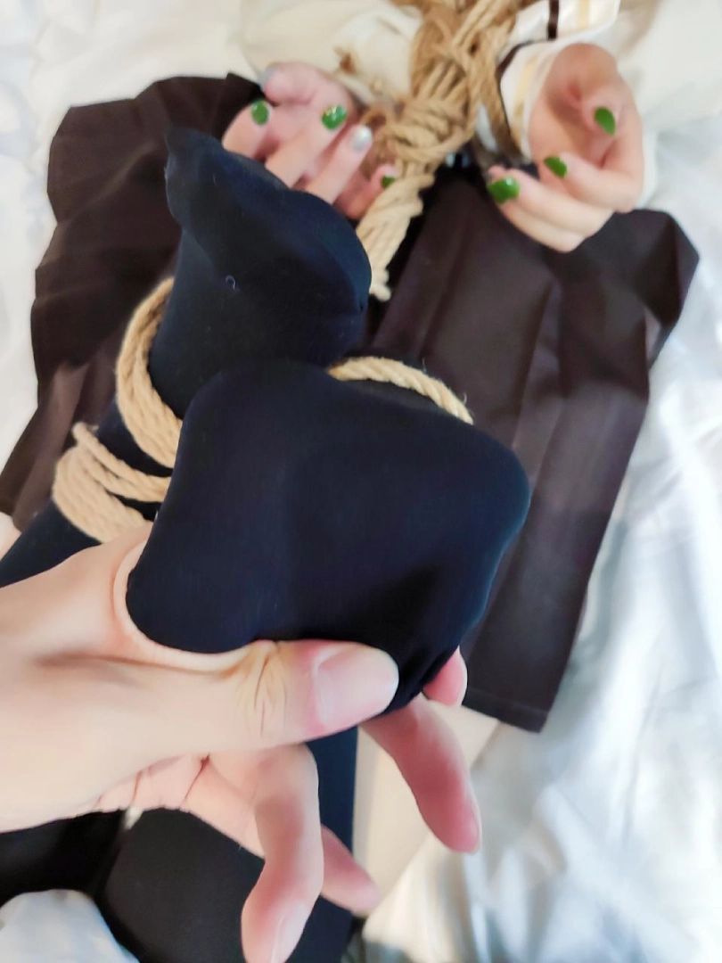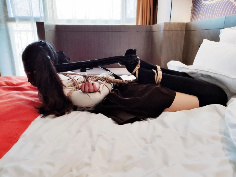 SET1 因为是临时起意决定要拍捆绑的,所以绳子带的并不是很够,好在妹子比较娇小,还是完成了日式驷马~妹子的小嘴也被用妹子自己穿了一天的袜子塞的满满的,并且用胶带封住~