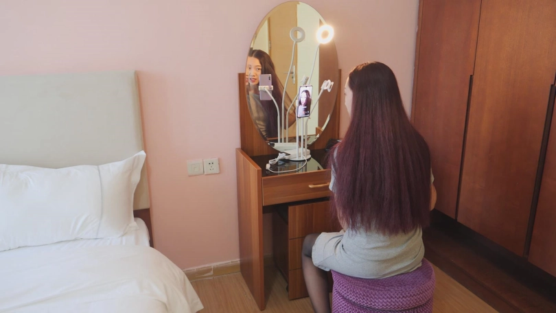 女二号旁白:“我叫刘晓琴,是一名主播。就是那种每天通过摄像头将自己的才能展现给粉丝看的主播,偶尔拍拍短视频和Vlog,跟粉丝增进感情。好在我放弃了一个拿固定工资的小公司,转身投入没有底薪的大公司,虽然有点累,也没有太多自由,但是,公司的运营不会让你饿肚子,虽然没有底薪,但是凭借他们的运营技巧,每个月也能轻松入万。而且很多小公司都是喜欢靠一些尺度博人眼球的,那种是我最不喜欢的。