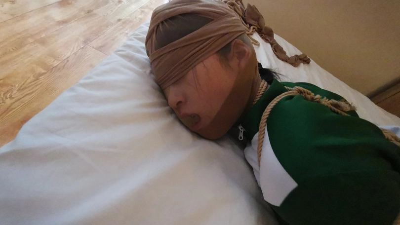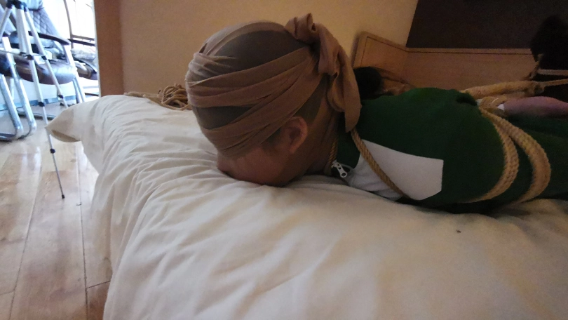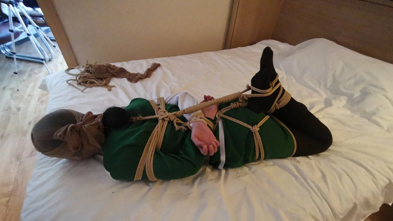 脱掉靴子趴在床上紧紧的捆绑成驷马,嘴里塞进丝袜,并用丝袜套住头蒙住眼睛。骗她有事出去下,小冷以为我真的出去了,房间就剩下被绑成粽子的自己,开始慌了,开始挣扎,并叨咕着什么(被堵着嘴,也不知道这丫头说的啥)。