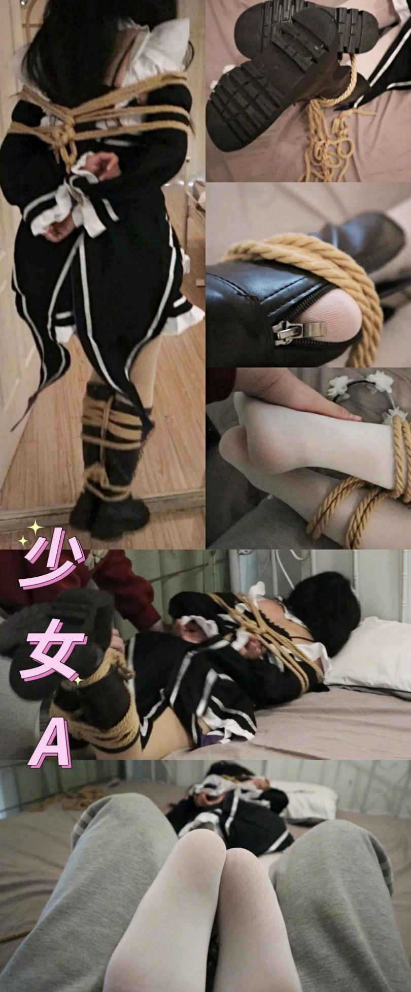 一开头 肉丝女仆的少女A 日式绑好 连皮靴上都捆绑满了绳子 手脚全部旁边 这么艰难的样子 少女A一蹦一跳的跳向房间里