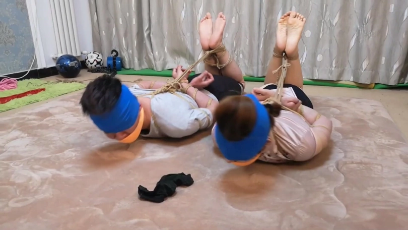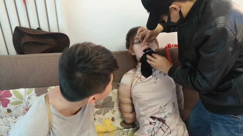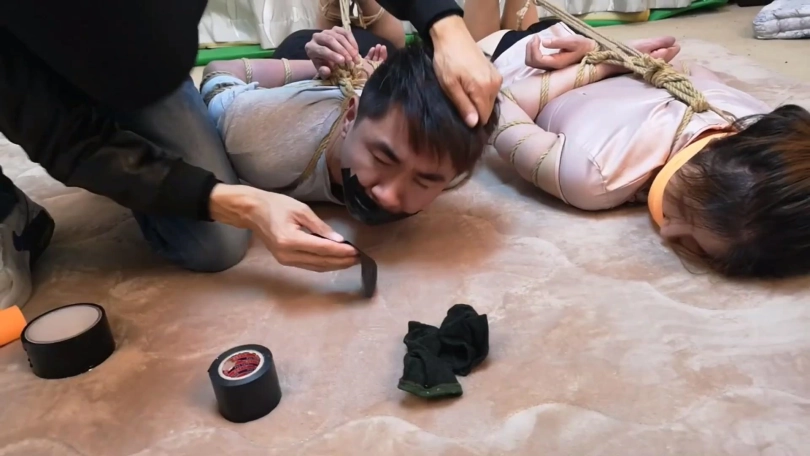 冷兮和其男友拼命扭动身体挣扎,但不幸挣扎一会儿后被劫匪发现,劫匪遂将他们捆成驷马,拽出他们口中塞得原味锦纶丝袜丢掉,分别拿两条丝巾塞入他们的口中,并在嘴外用5张黑色宽胶布封嘴,再用黑色胶带和橙色弹力自粘绷带缠绕多圈封嘴,封得严严实实。
