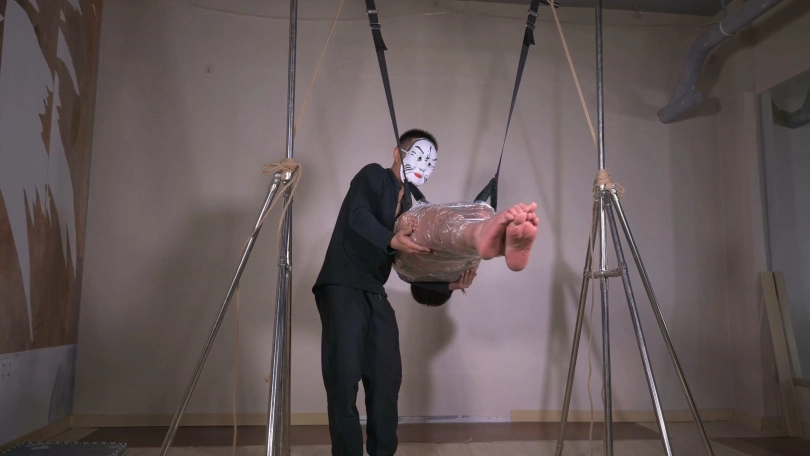 一直想尝试一下木乃伊包裹后把绳模悬吊起来,一时间也没有找到参照,本来想用四个吊点,后来还是抱着试一试的态度只用大腿根部两点来吊,没想到竟然得到出其不意的效果,绳模不但能保持住平衡,还能把她放平,TK时的挣扎也能维持平衡,绳模坚持的时间也比较长,一次非常成功的尝试。