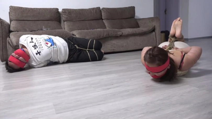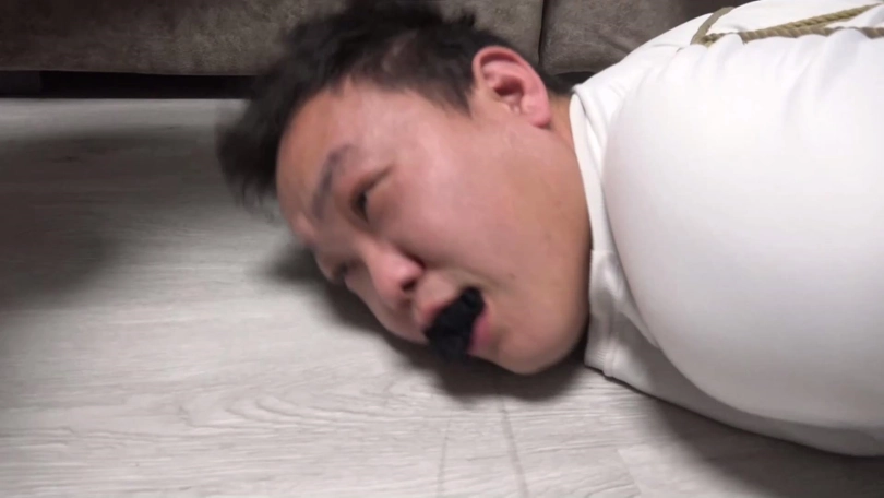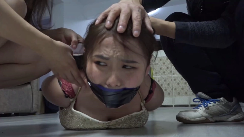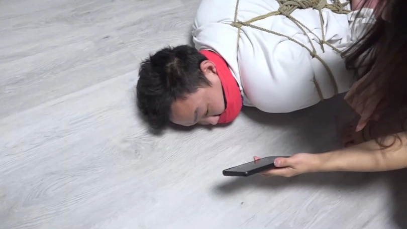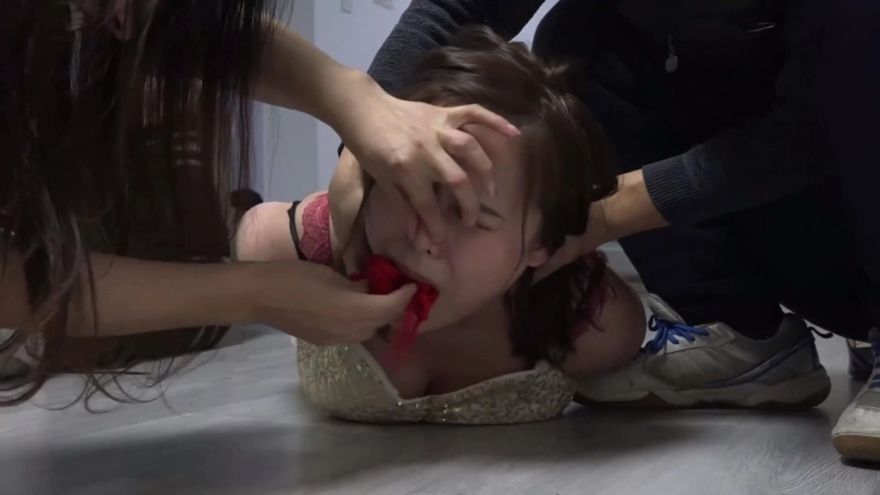 猝不及防的情侣二人被李然锁哥袭击捆绑结实,嘴里还被塞口球塞住。考虑到二人不老实,李然为了给他们点颜色看看,脱掉韩经洁男友脚上穿的两只原味臭烘烘的锦纶丝袜,分别塞到韩经洁和她男友嘴里,令二人恶心痛苦。